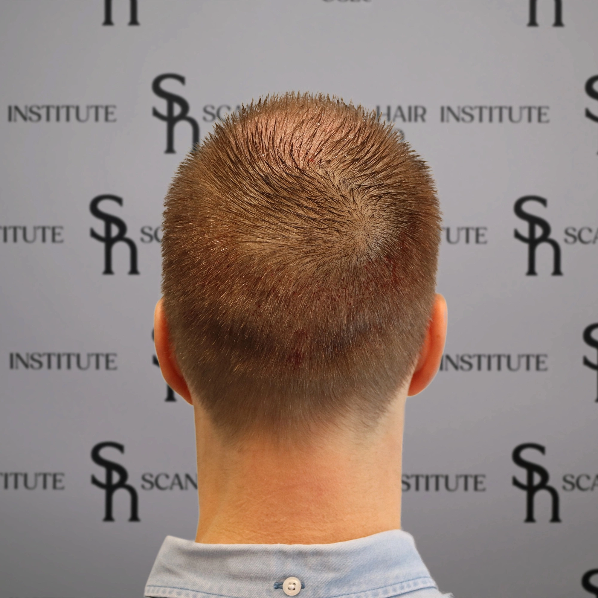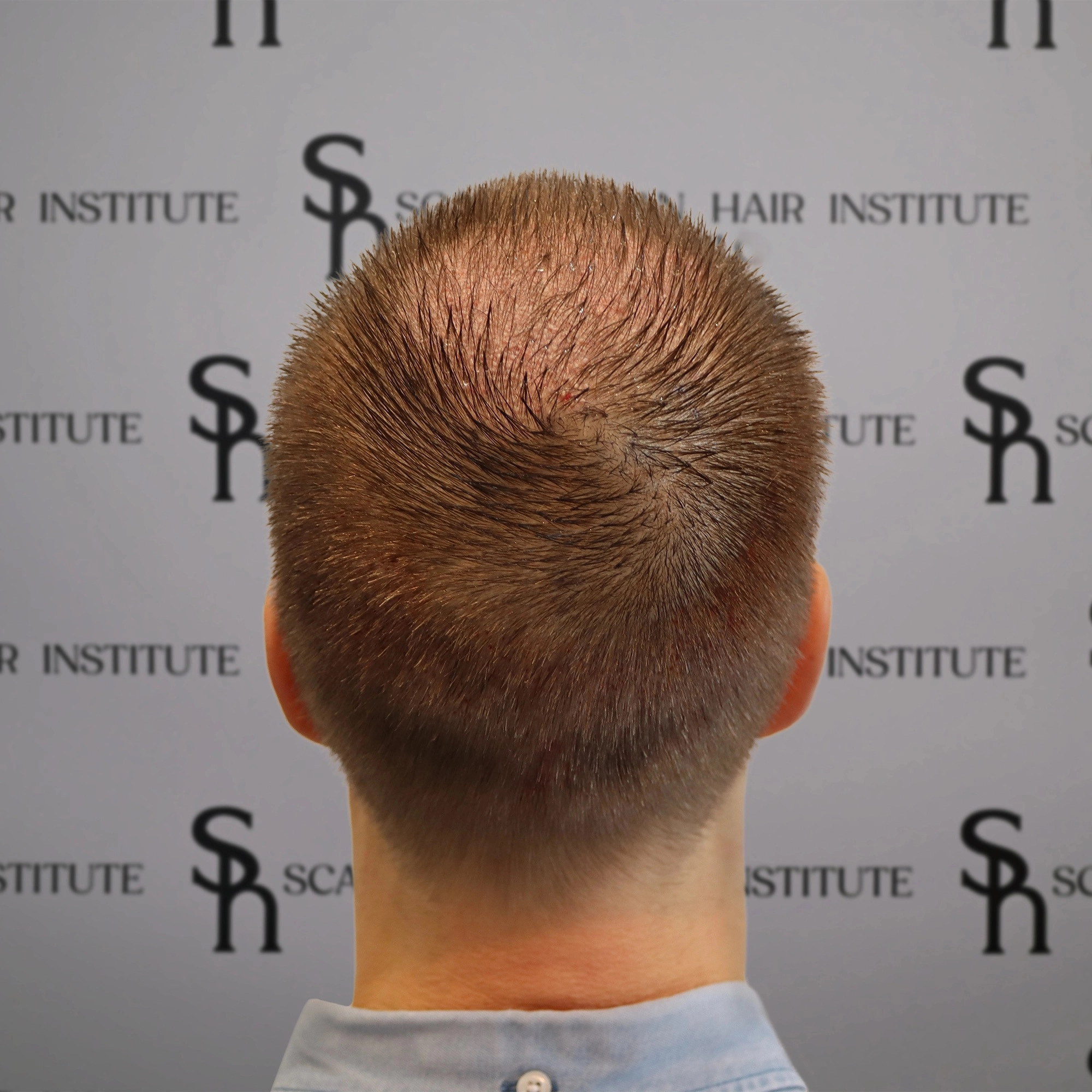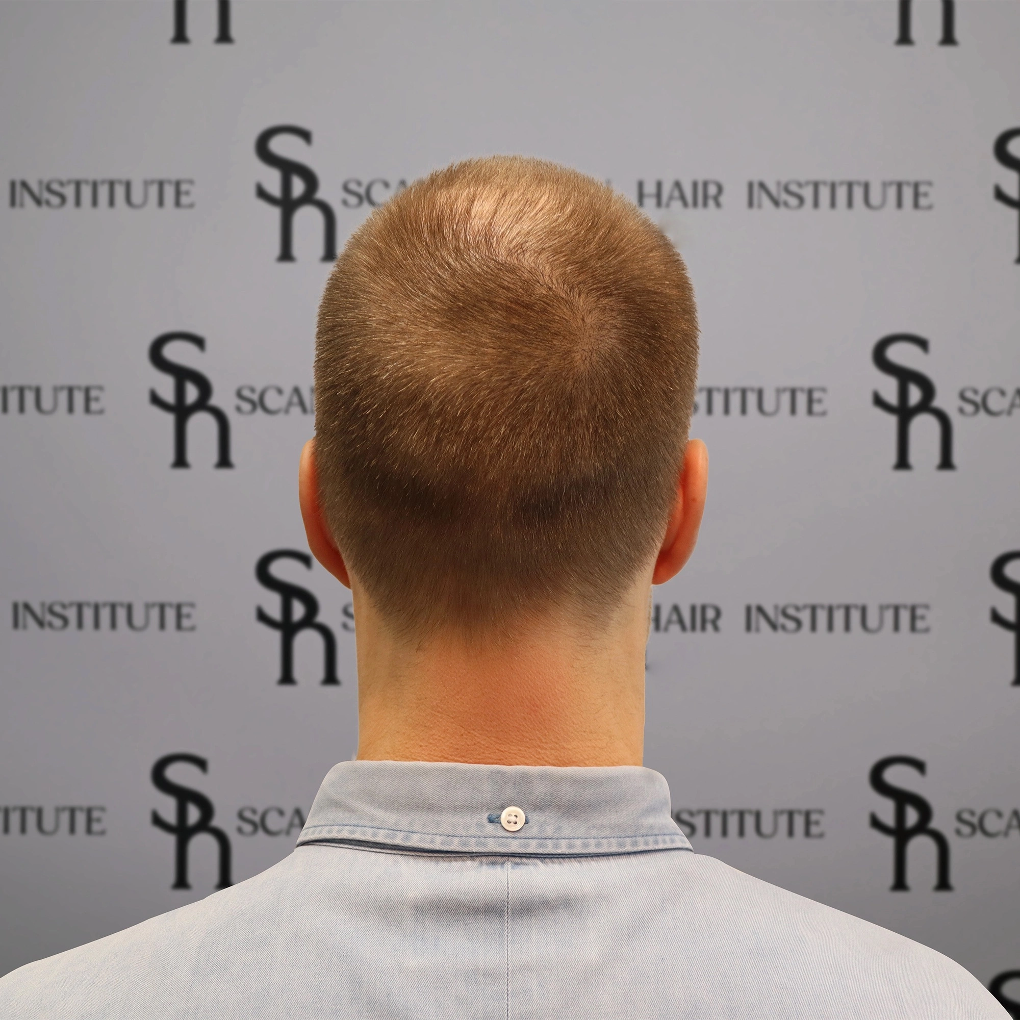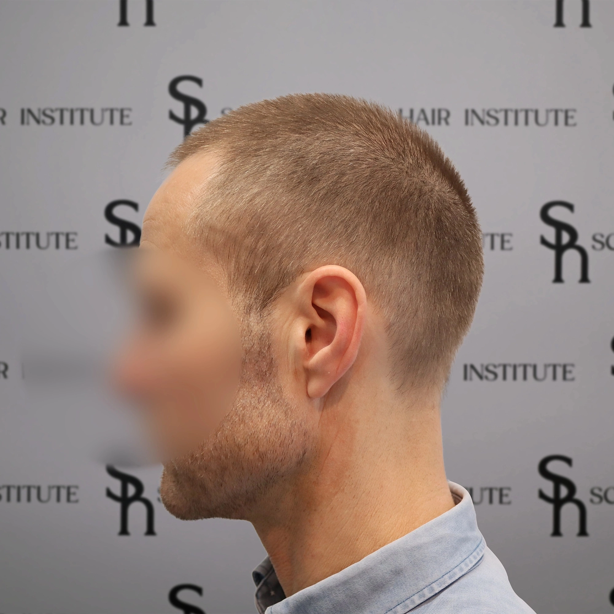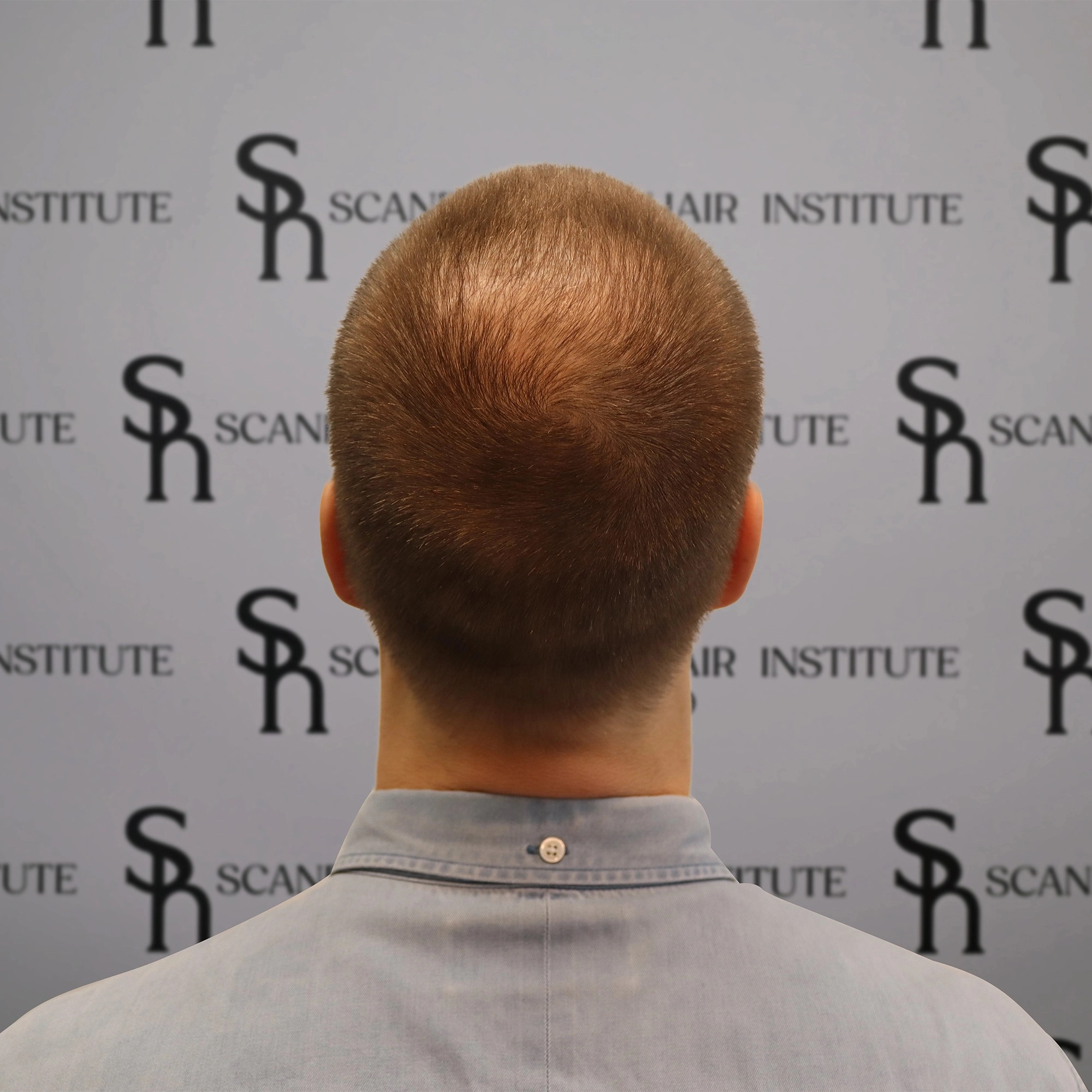 Här kan du se hans resultat 14 månader efter proceduren. Att kamma isär håret i mottagarområdet ger full transparens och säkerställer en tydlig vy av den verkliga tätheten – något som borde vara standard när man visar resultat.
