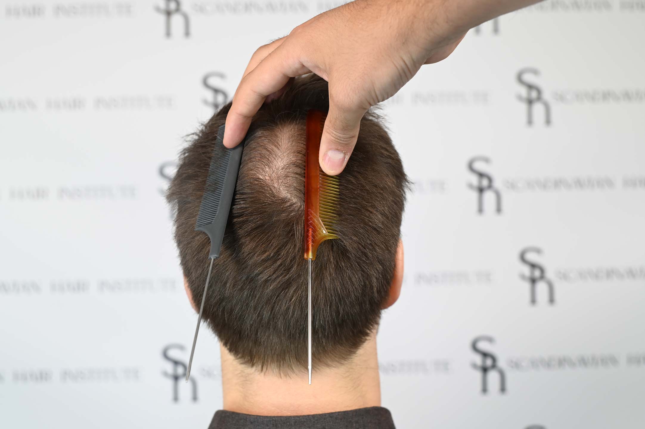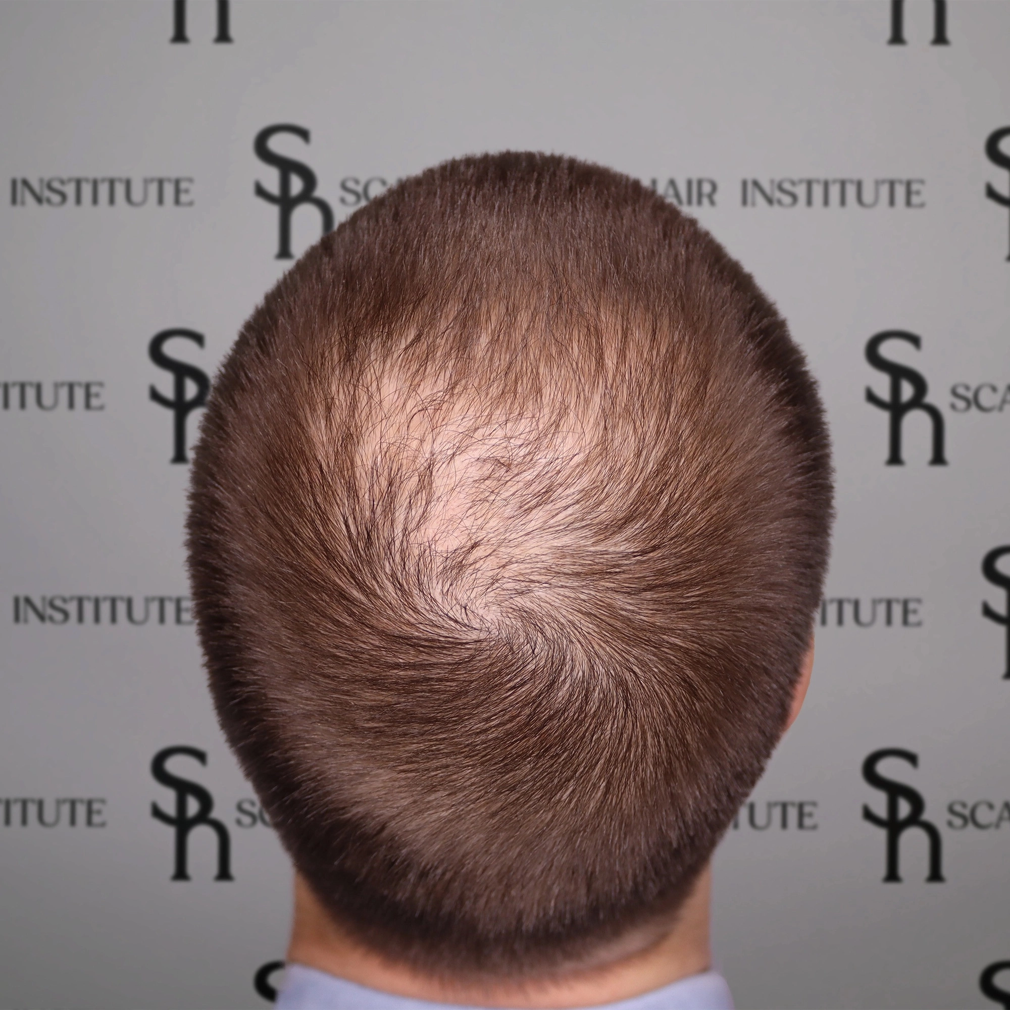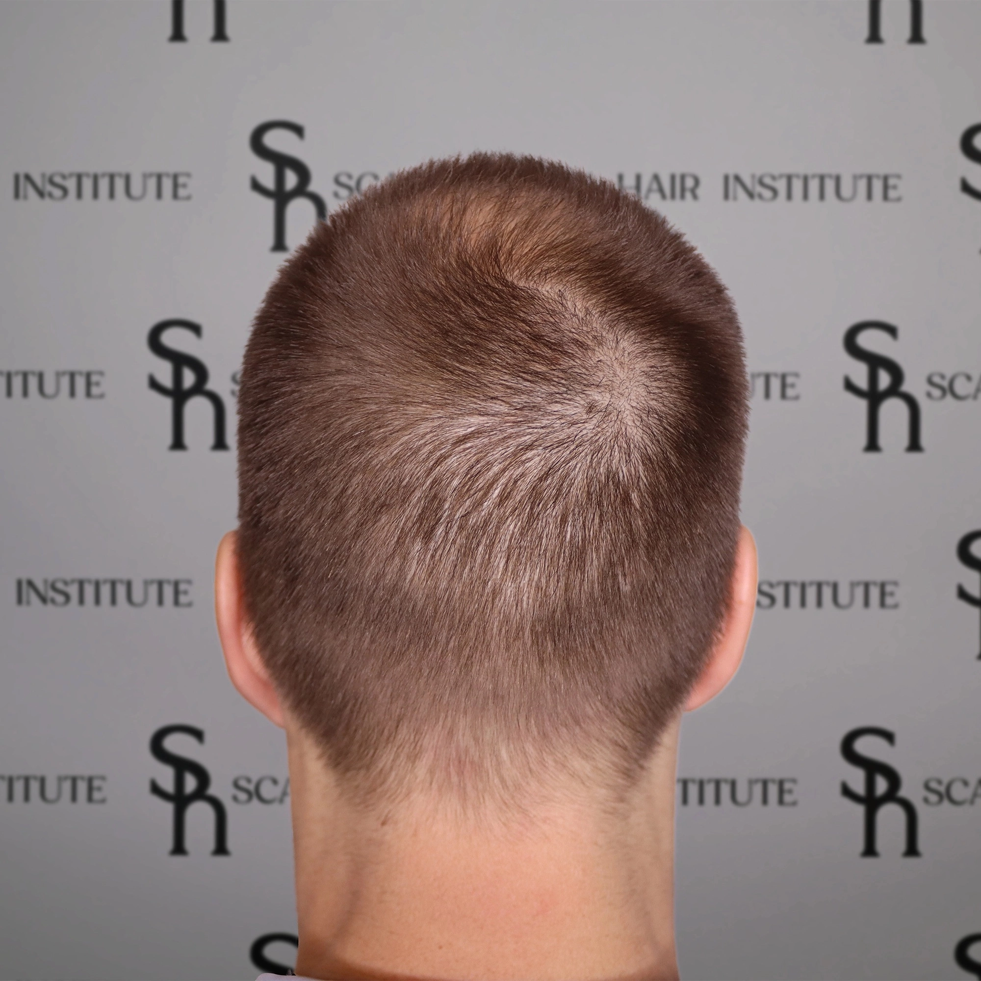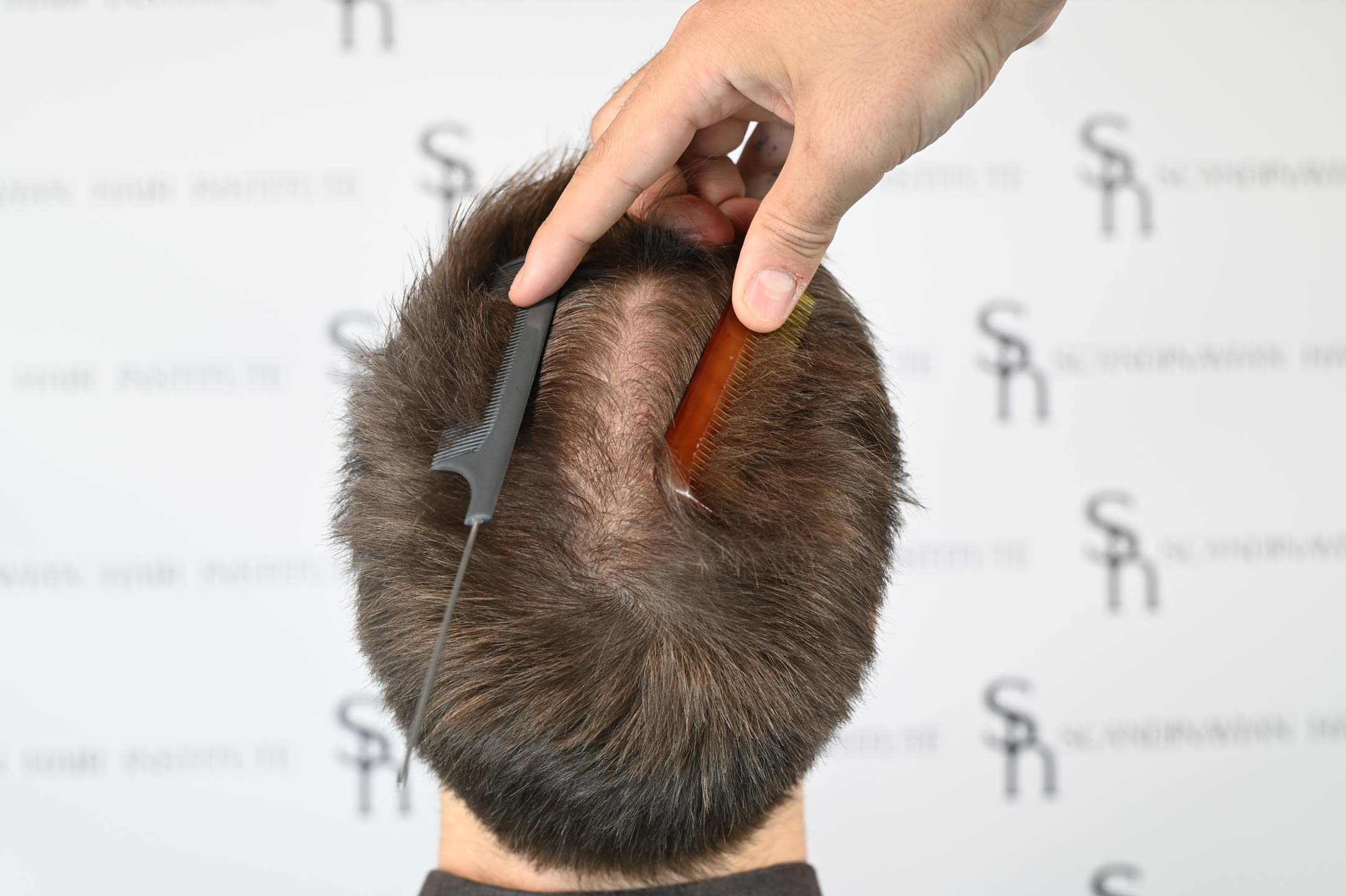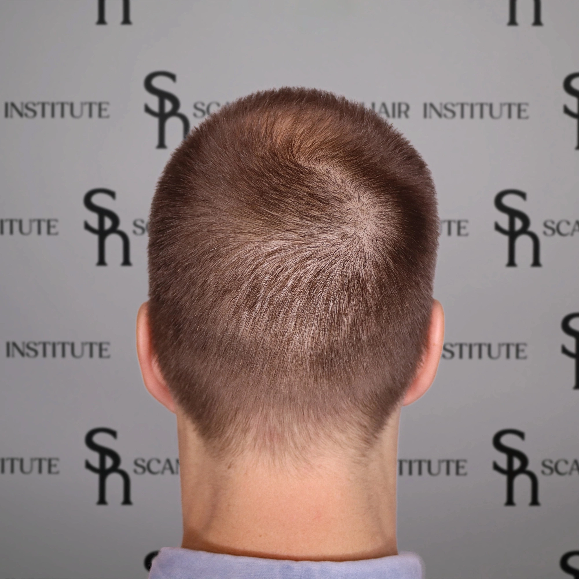 Här kan du se hans resultat 14 månader efter proceduren. Att kamma isär håret i mottagarområdet ger full transparens och säkerställer en tydlig vy av den verkliga tätheten – något som borde vara standard när man visar resultat.
