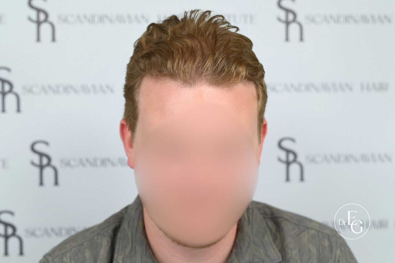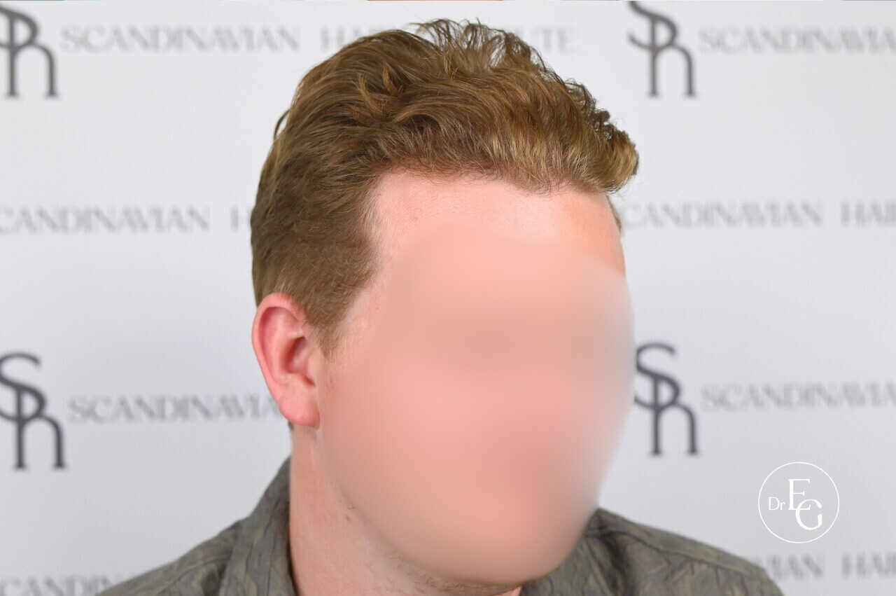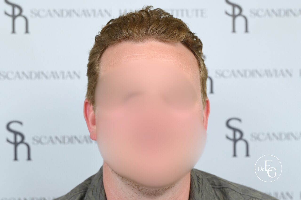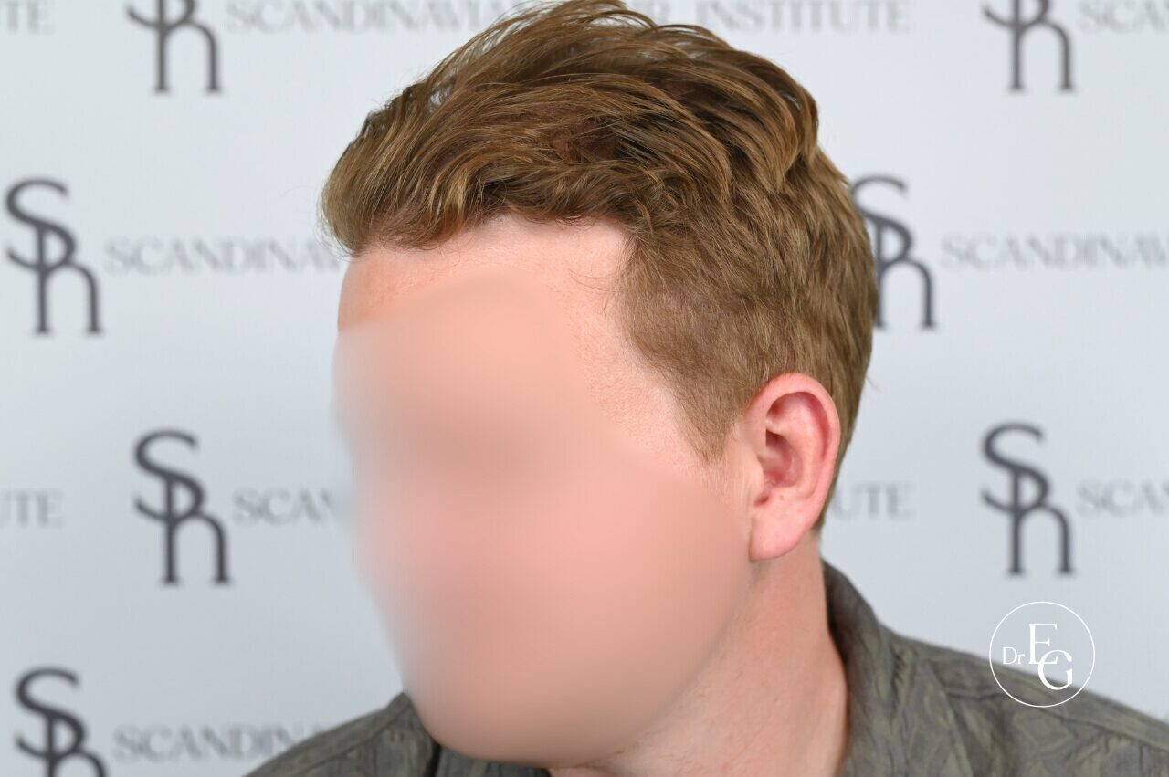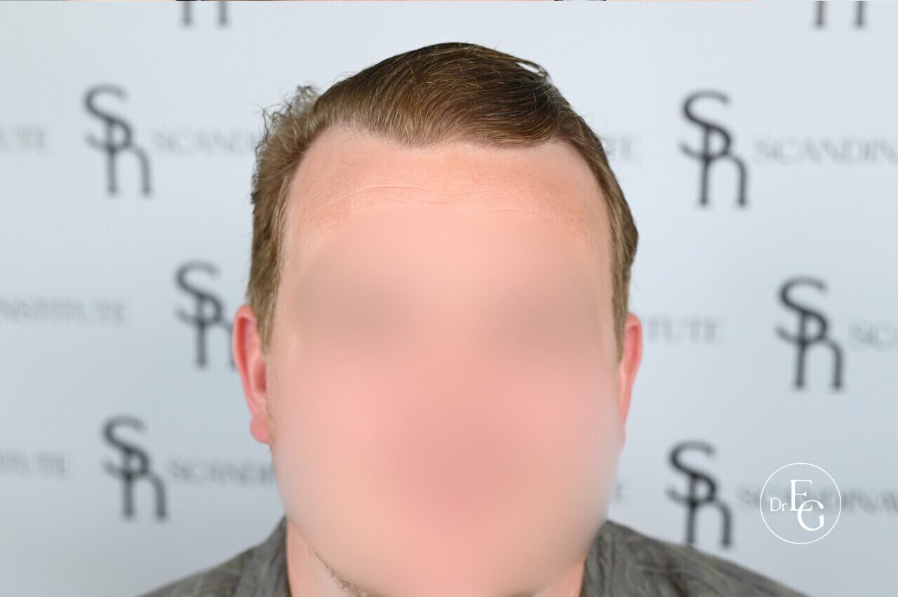 Detta fall visar en blond patient med djupa vikande tinningar, som återställdes med hjälp av 2 200 grafts. Resultaten dokumenteras med både torrt och vått hår för att tydligt visa den naturliga densiteten och hur hårlinjen integrerats på ett harmoniskt sätt.