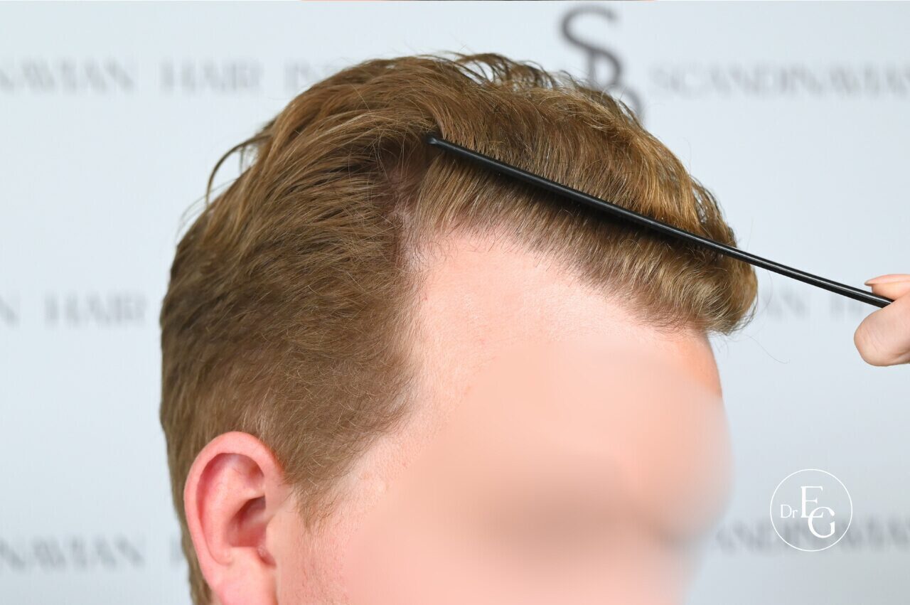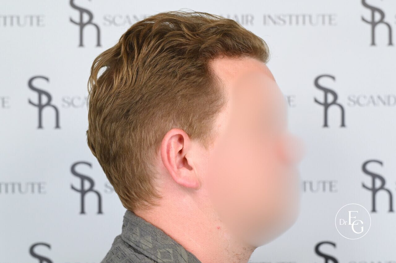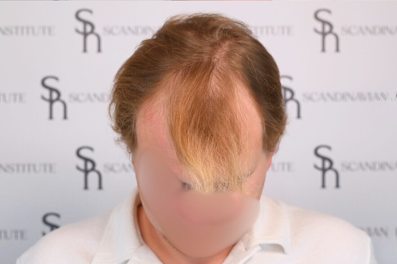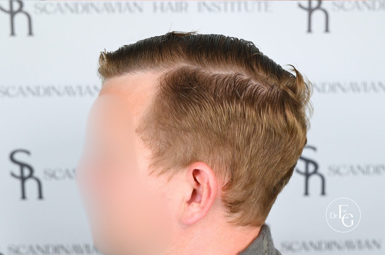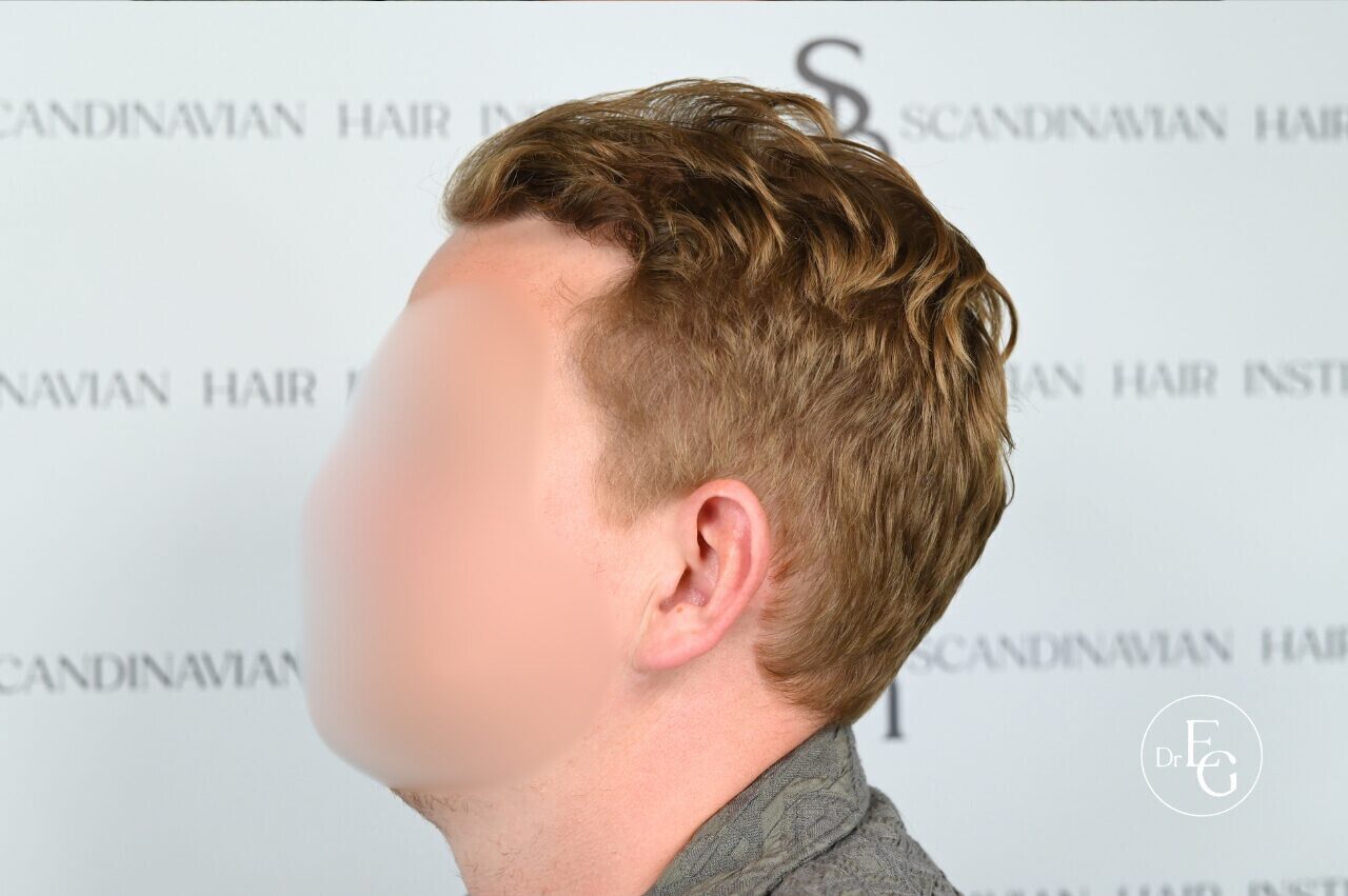 Detta fall visar en blond patient med djupa vikande tinningar, som återställdes med hjälp av 2 200 grafts. Resultaten dokumenteras med både torrt och vått hår för att tydligt visa den naturliga densiteten och hur hårlinjen integrerats på ett harmoniskt sätt.