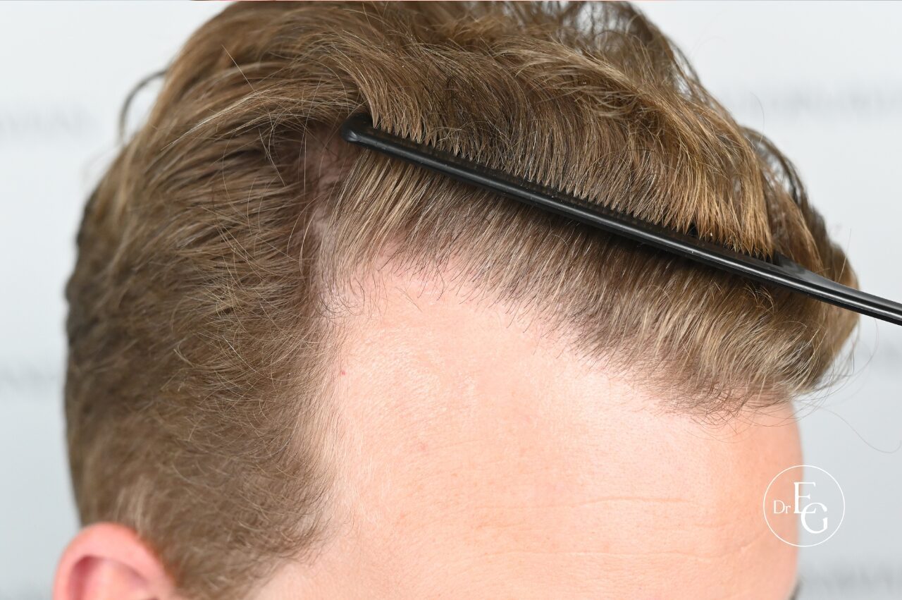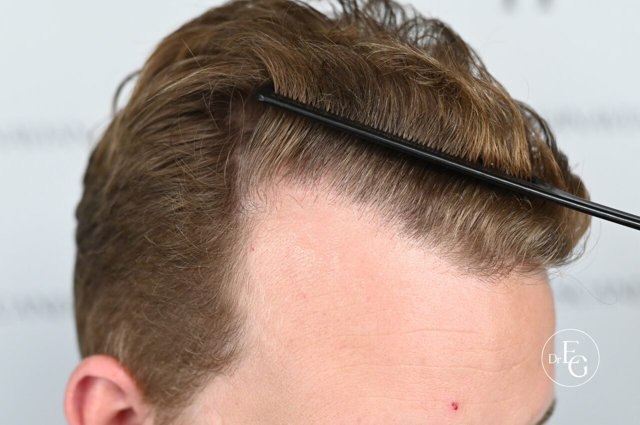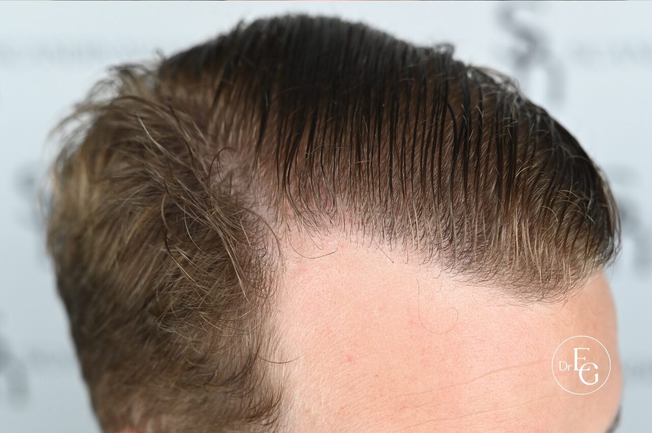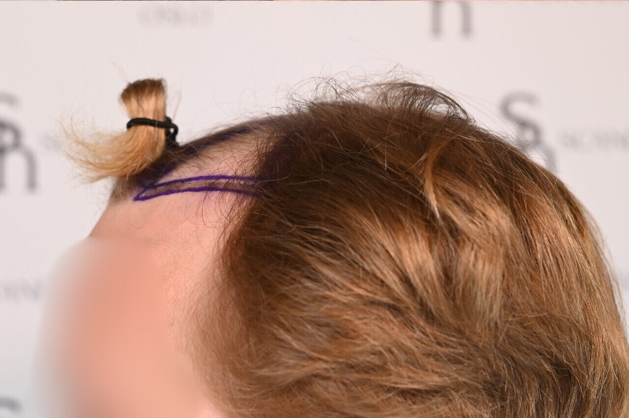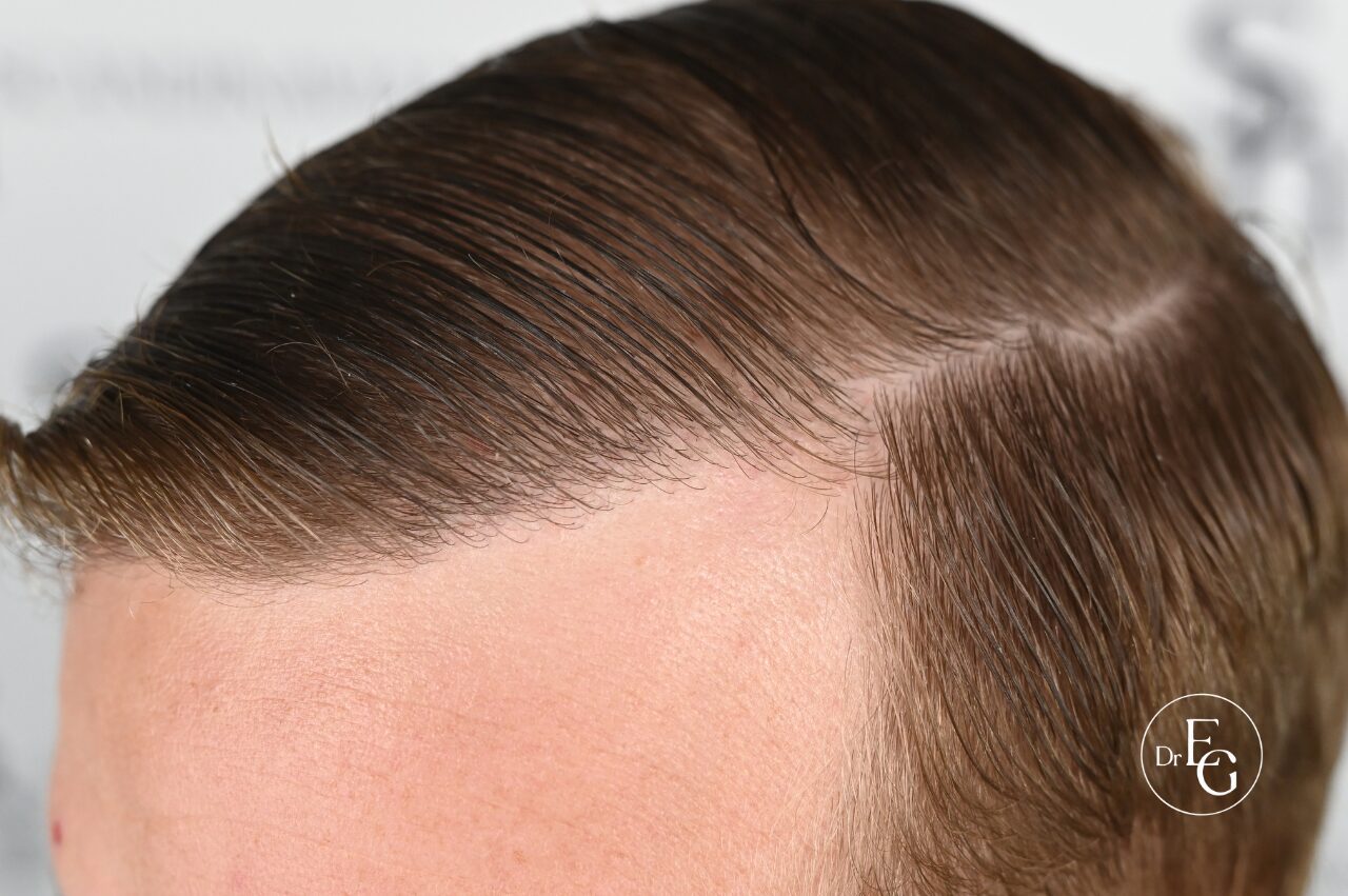 Detta fall visar en blond patient med djupa vikande tinningar, som återställdes med hjälp av 2 200 grafts. Resultaten dokumenteras med både torrt och vått hår för att tydligt visa den naturliga densiteten och hur hårlinjen integrerats på ett harmoniskt sätt.