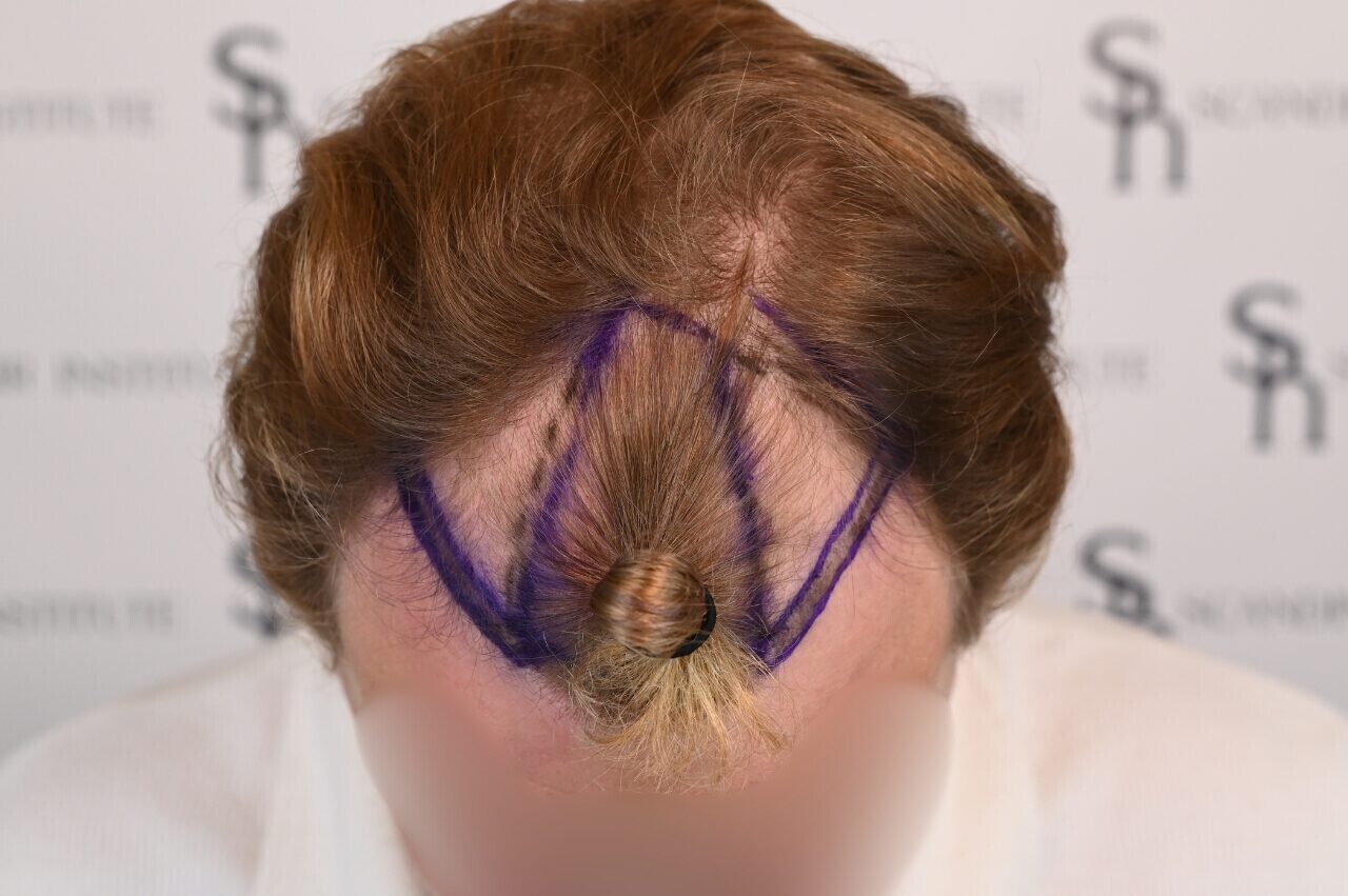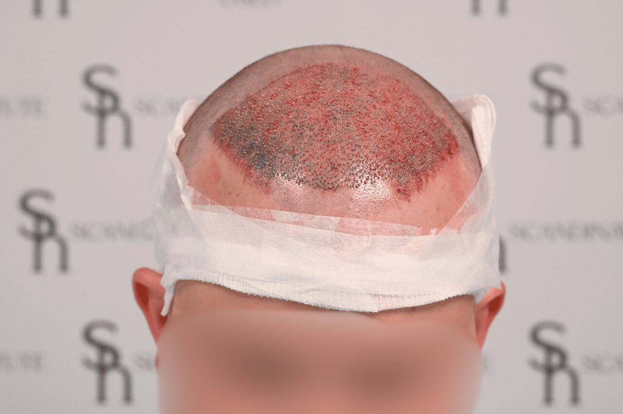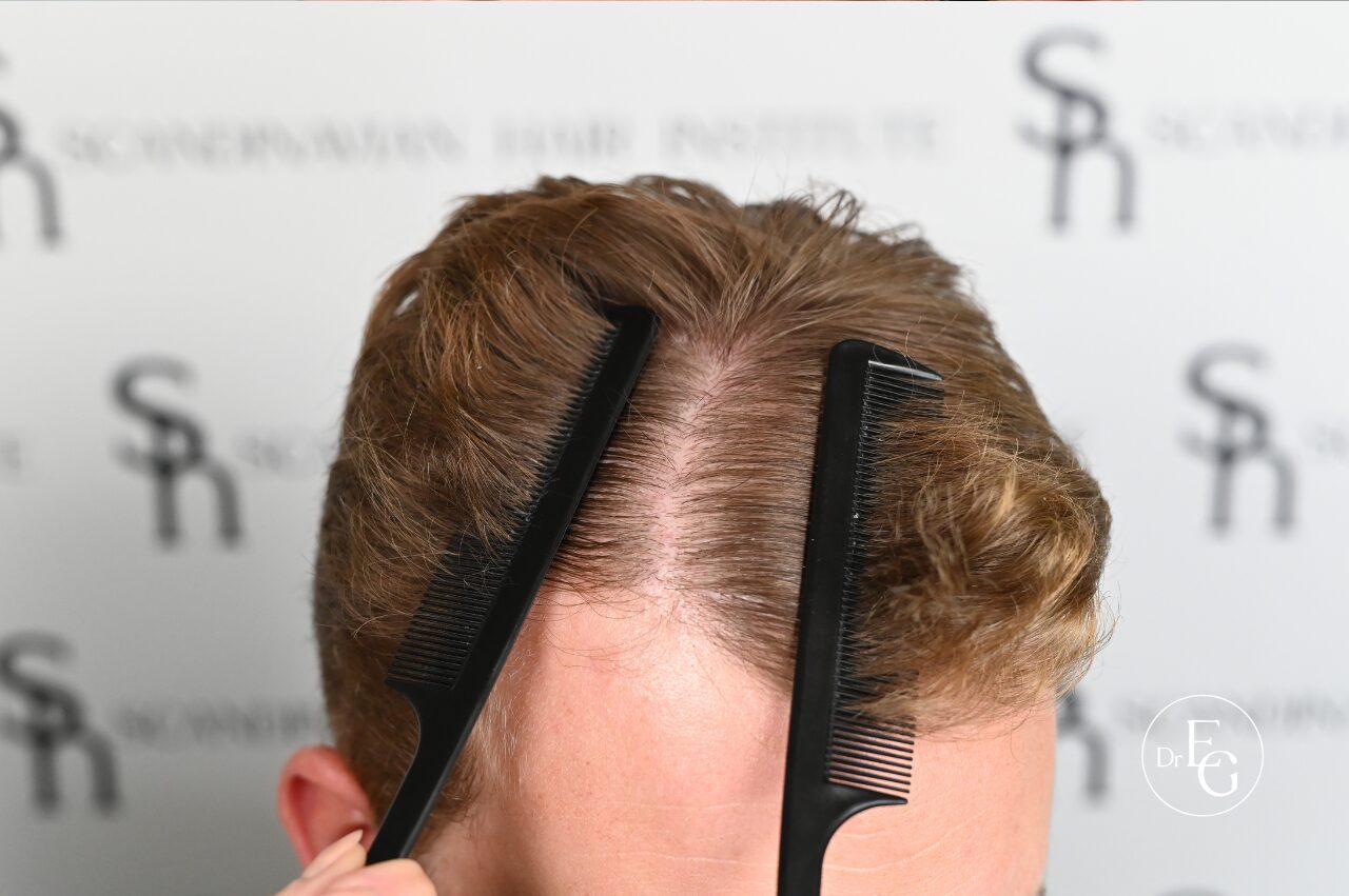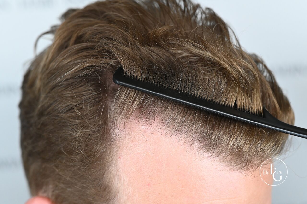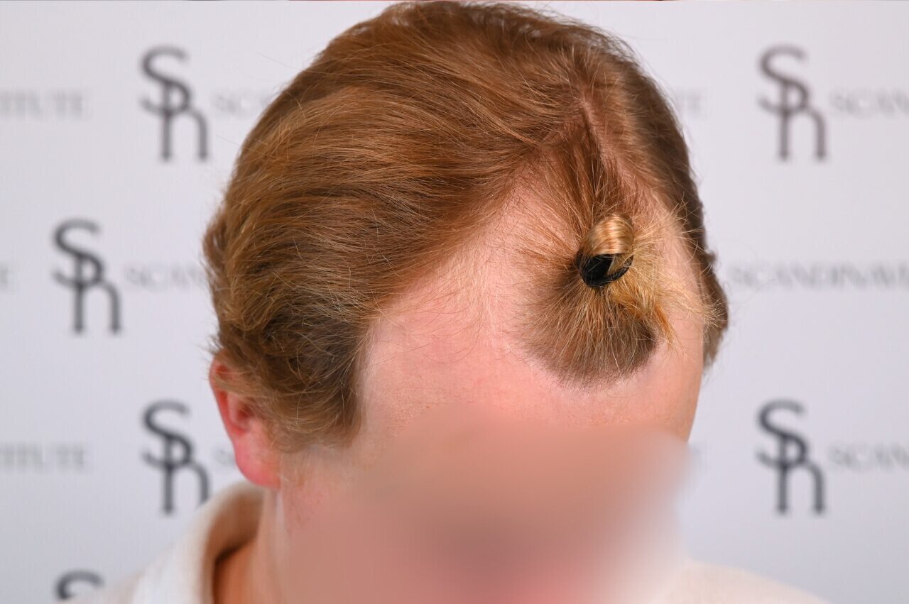 Detta fall visar en blond patient med djupa vikande tinningar, som återställdes med hjälp av 2 200 grafts. Resultaten dokumenteras med både torrt och vått hår för att tydligt visa den naturliga densiteten och hur hårlinjen integrerats på ett harmoniskt sätt.