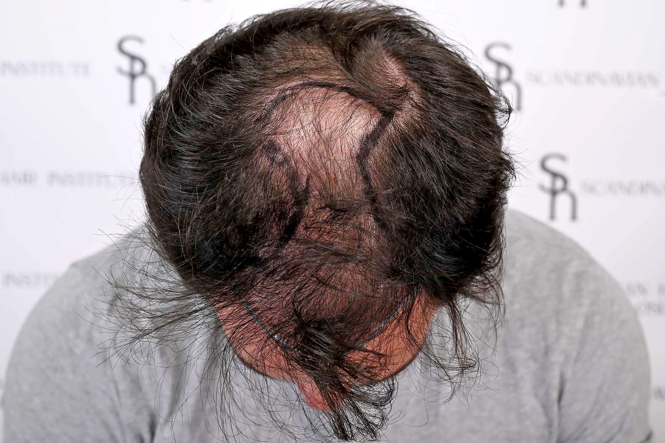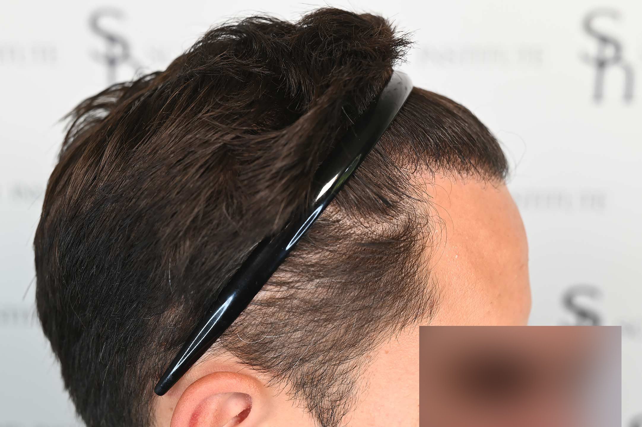 Att arbeta med svart hår på vit hud är alltid mer utmanande när man strävar efter ett verkligt naturligt utseende. Davids donatorområde hade skördats ojämnt av en annan klinik, där alla hårsäcksgrupper hade tagits från ett litet 12 x 7 cm rektangulärt område. Detta var mycket synligt när vi rakade honom. Hans hårlinje var också fylld med multigrafter placerade i fel vinklar, vilket gjorde att den såg hård och onaturlig ut.