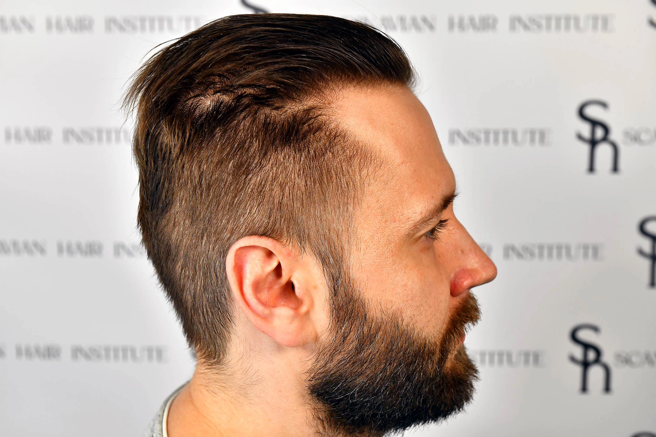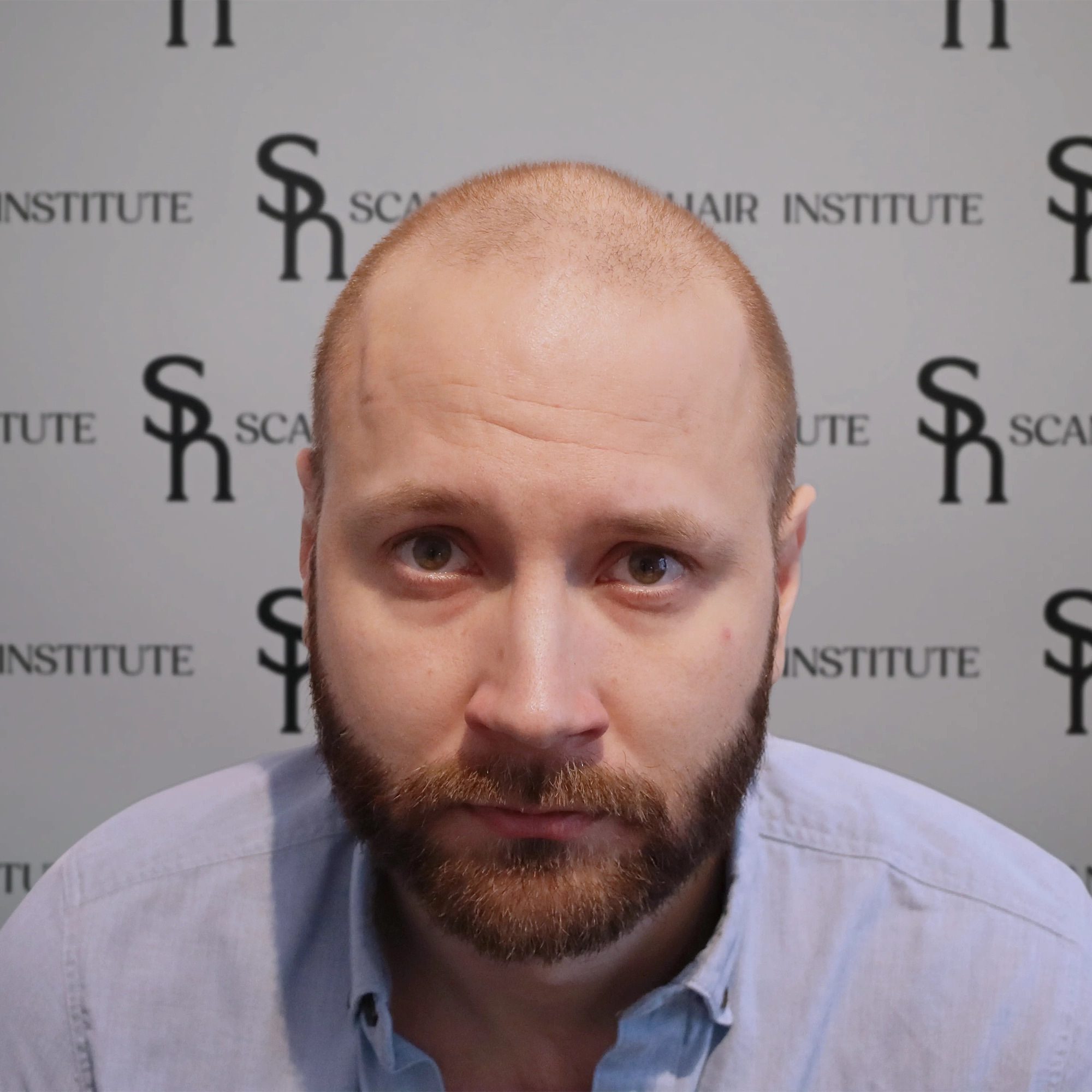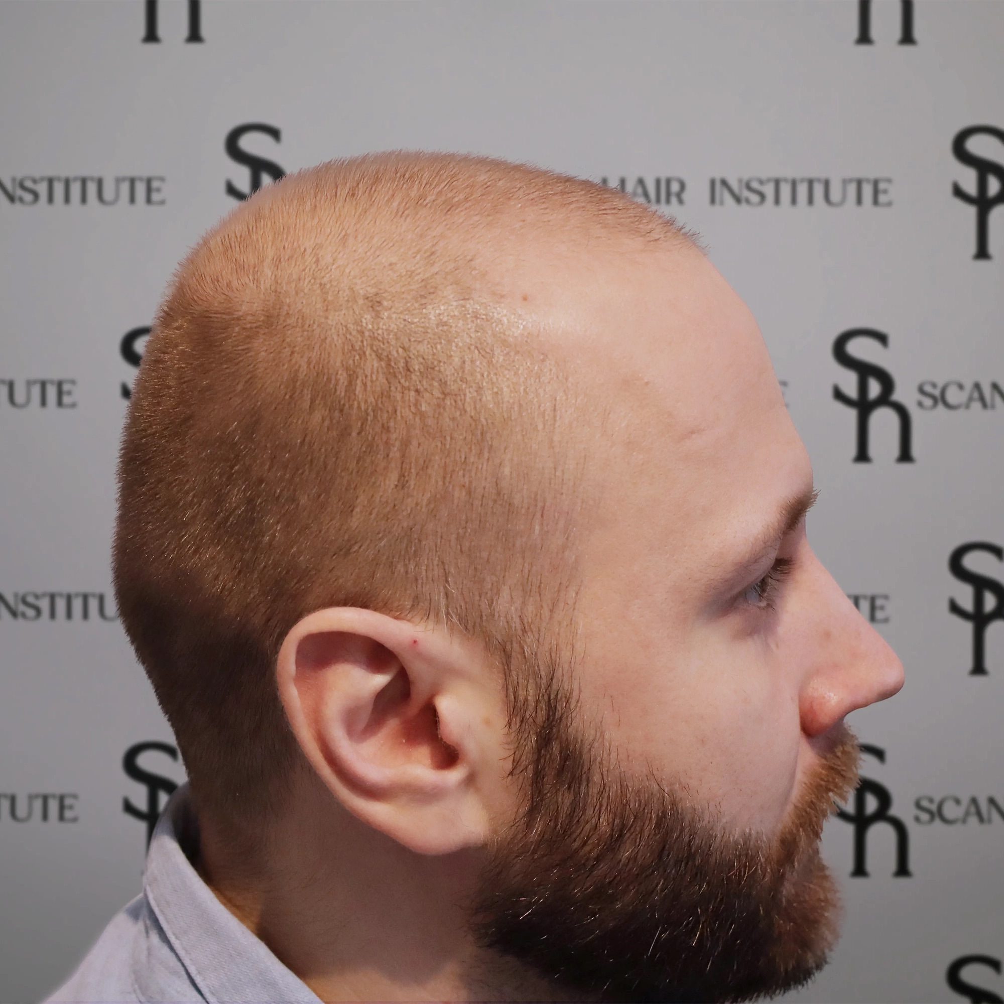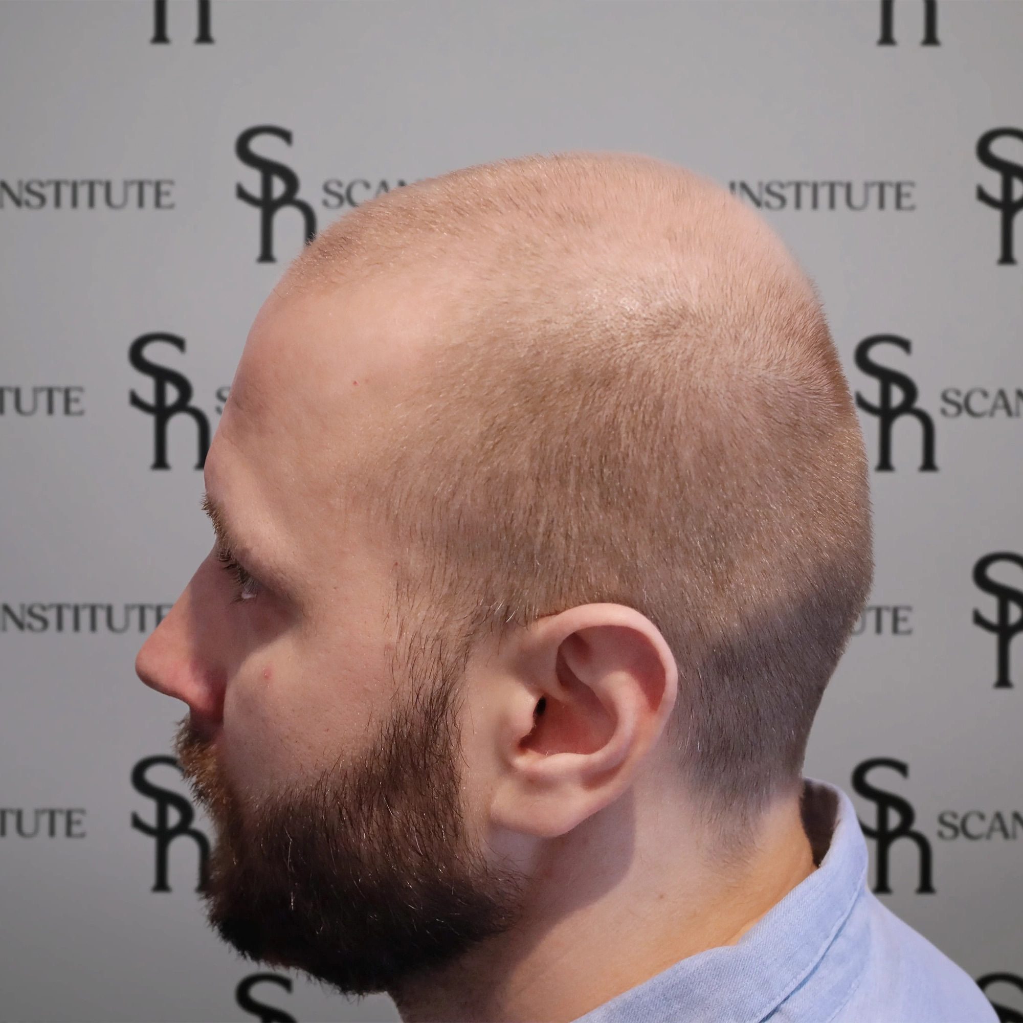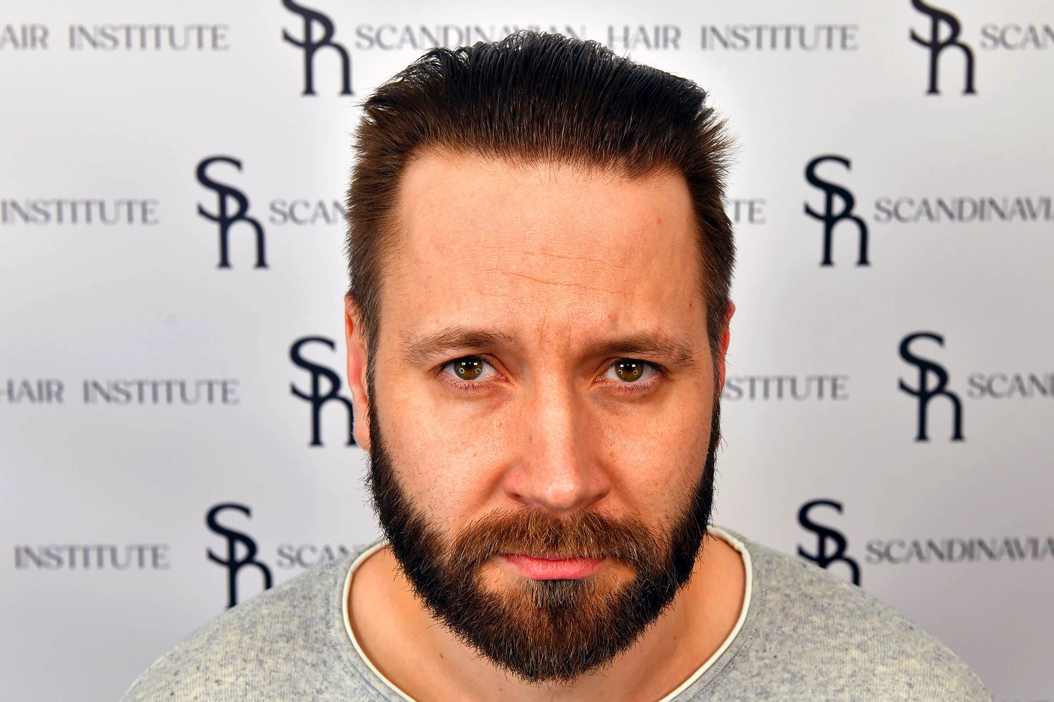 Av de 5 500 grafts placerades 550 fina singelhår strategiskt längs fronten för att säkerställa en mjuk och realistisk övergång, medan de resterande 4 950 grafts fördelades över hårlinjen, toppen och hjässan. Resultatet är ett fylligt och naturligt hår med inga synliga tecken på tidigare skallighet.