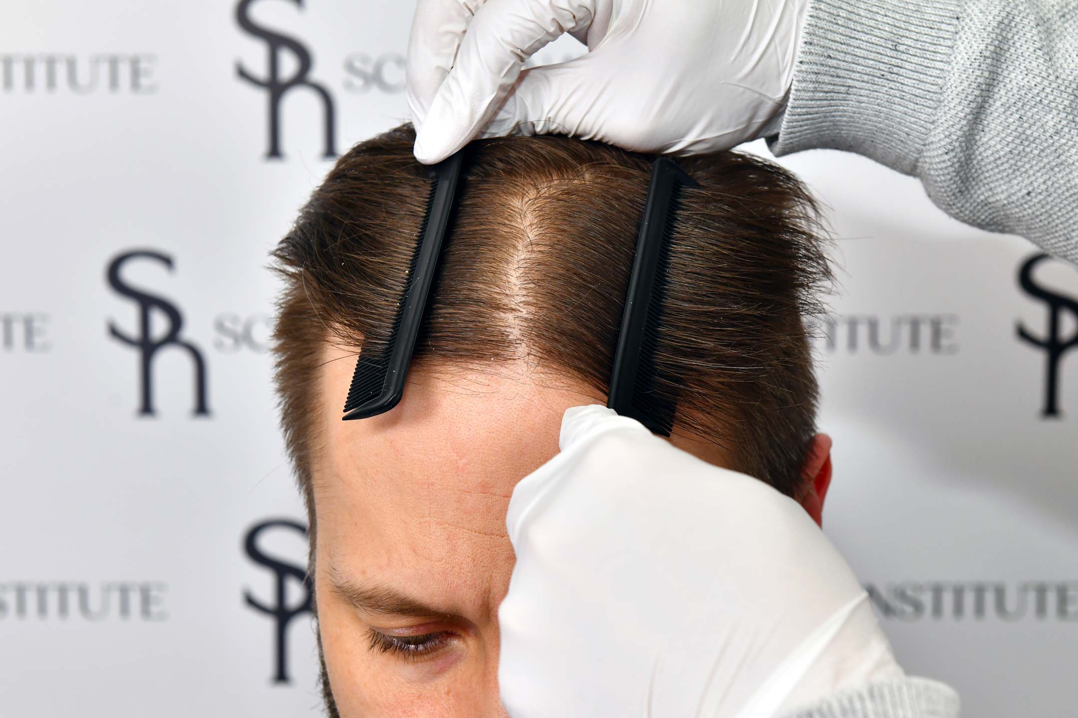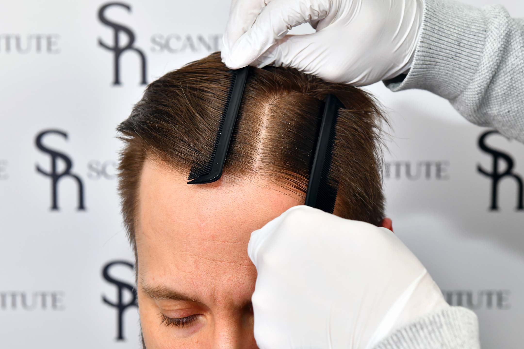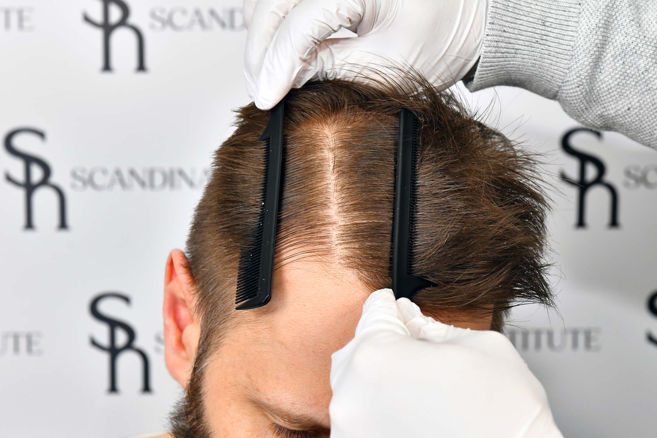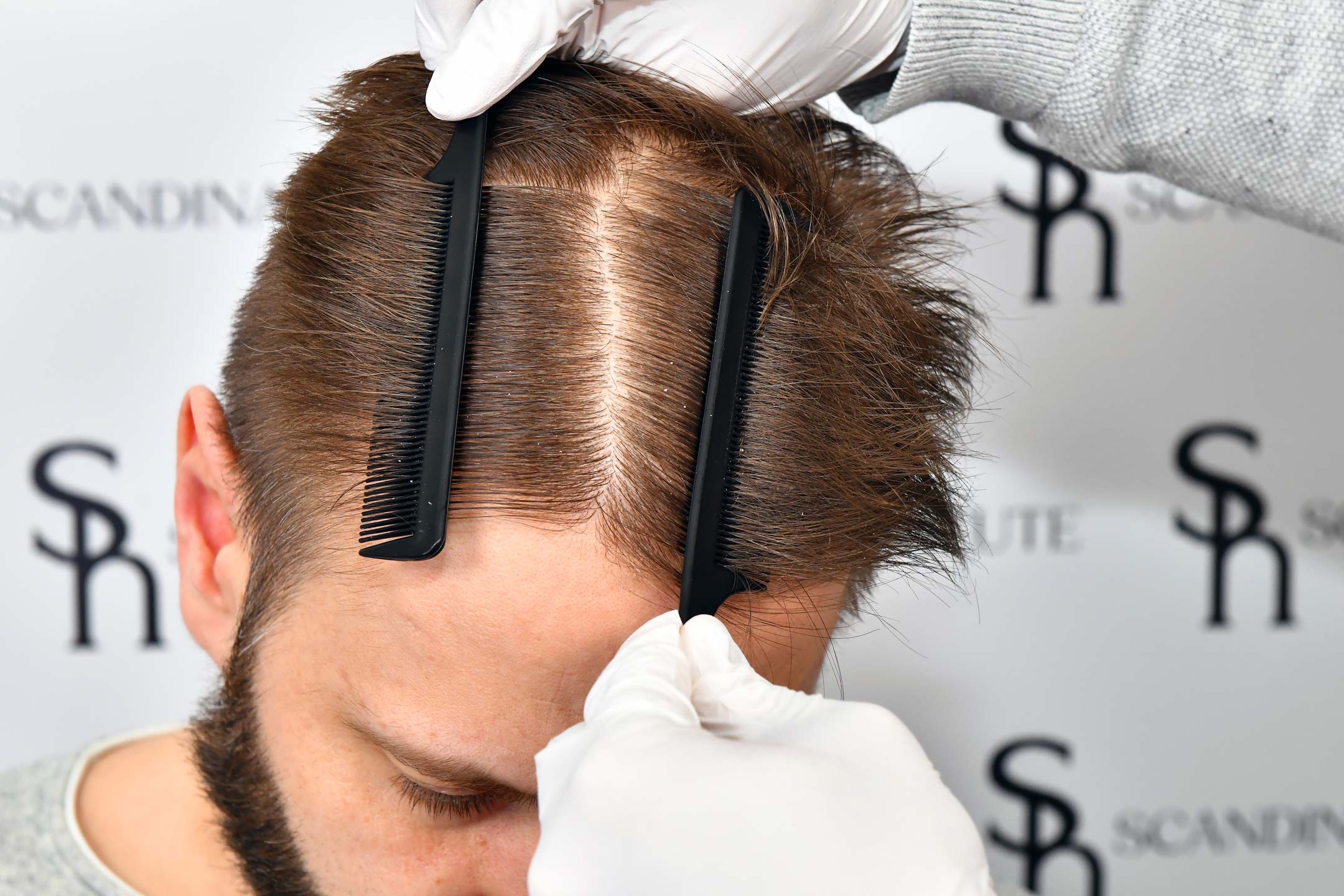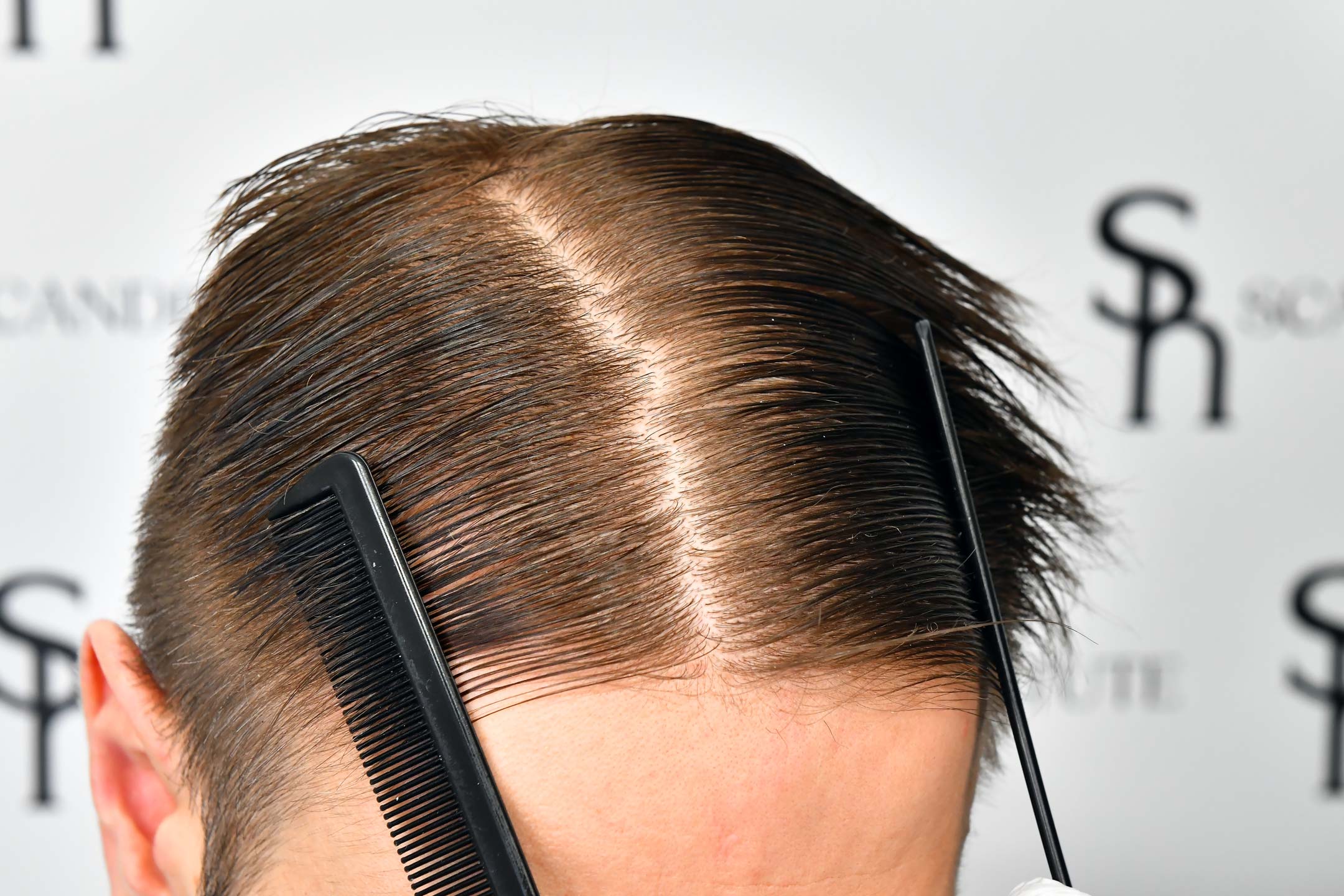 Av de 5 500 grafts placerades 550 fina singelhår strategiskt längs fronten för att säkerställa en mjuk och realistisk övergång, medan de resterande 4 950 grafts fördelades över hårlinjen, toppen och hjässan. Resultatet är ett fylligt och naturligt hår med inga synliga tecken på tidigare skallighet.