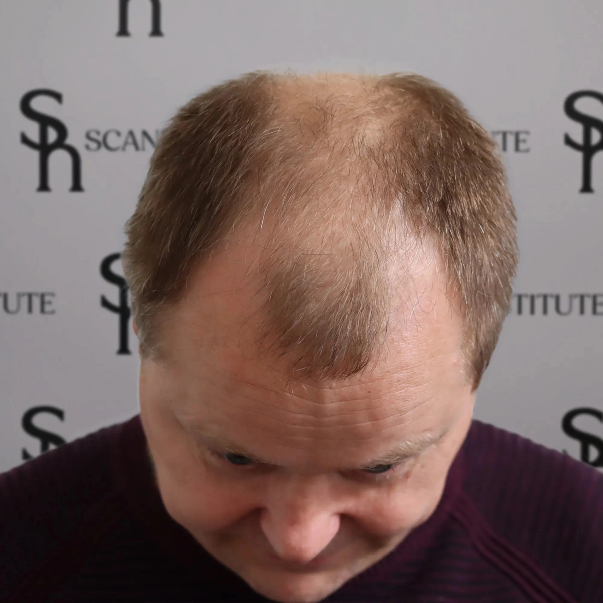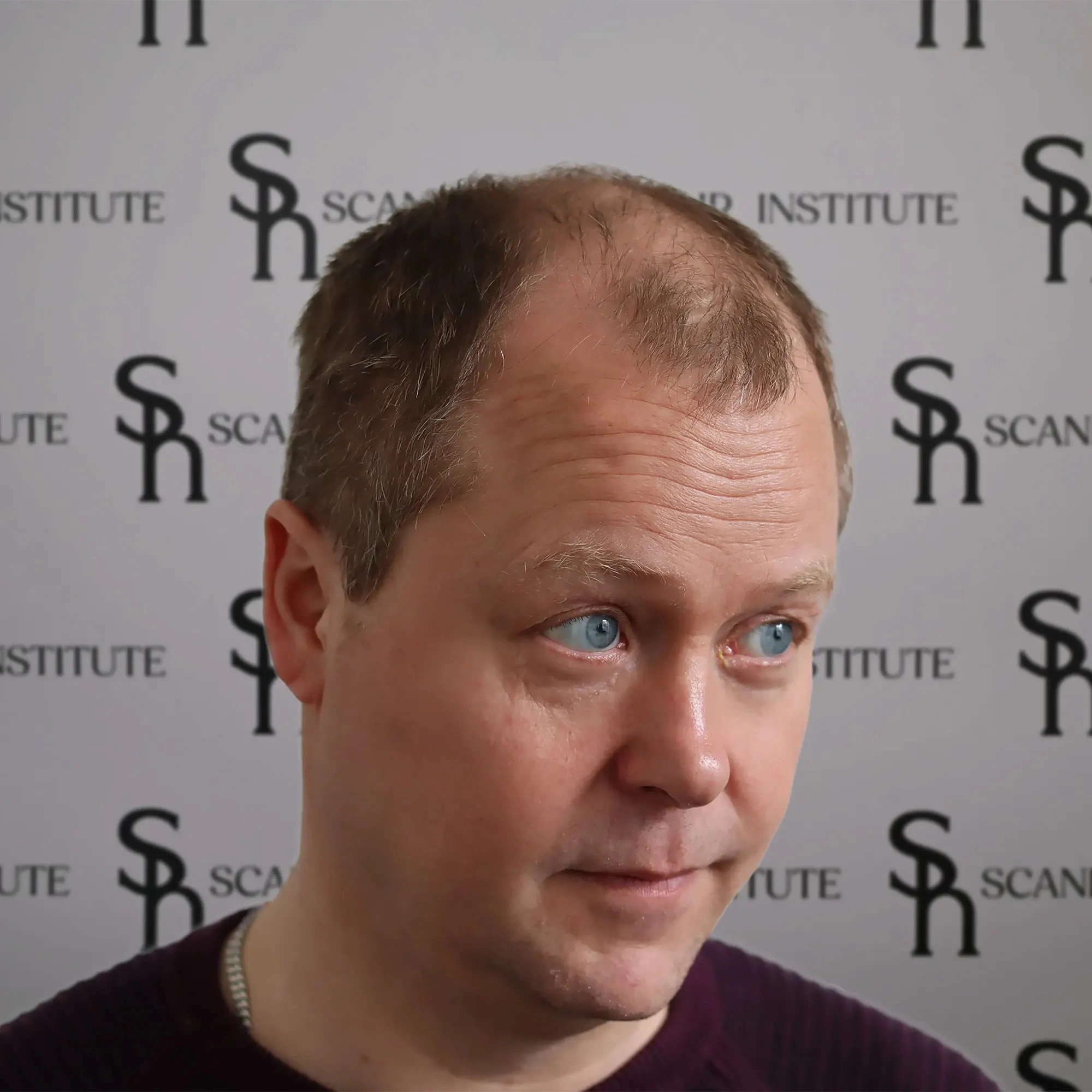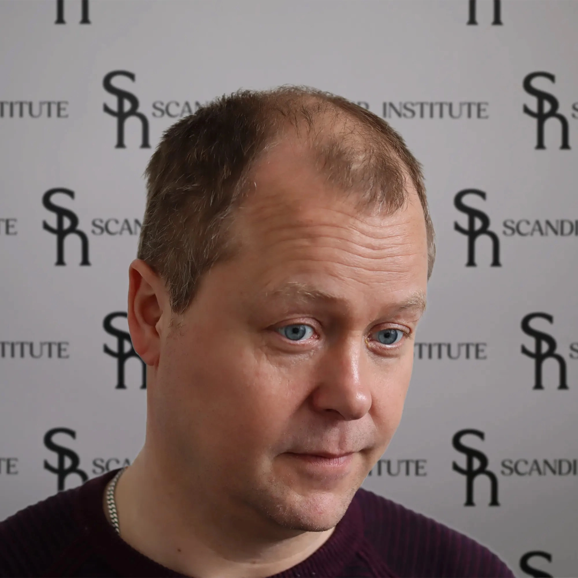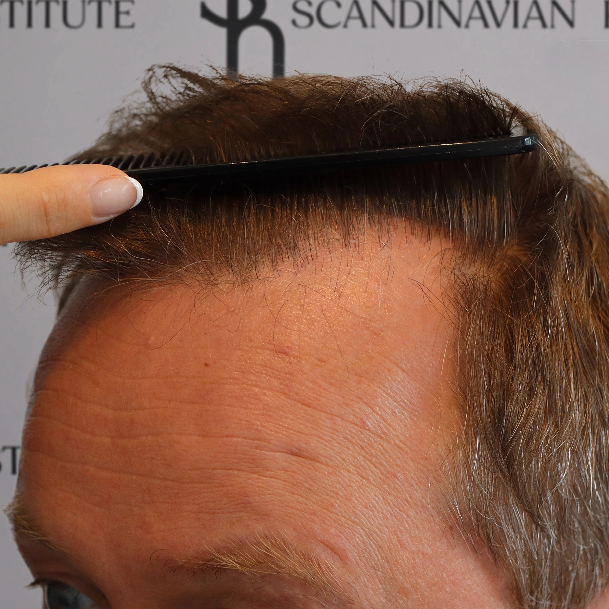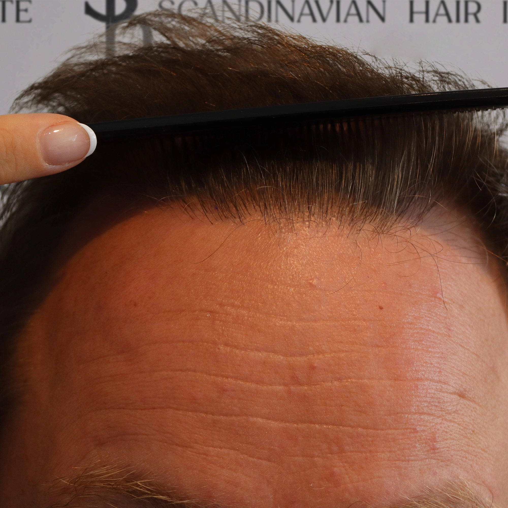 Bengt, 54 år, kom till oss från Tromsø utan hår på toppen av huvudet. Vi behandlade honom med över 5 500 hårsäcksgrupper, skapade en naturlig, åldersanpassad hårlinje, vi arbetade oss upp till kronan, och fyllde den med en tät täckning. Se detaljerade närbilder av hans hårlinje och hela hårbotten i hans album efter behandling.