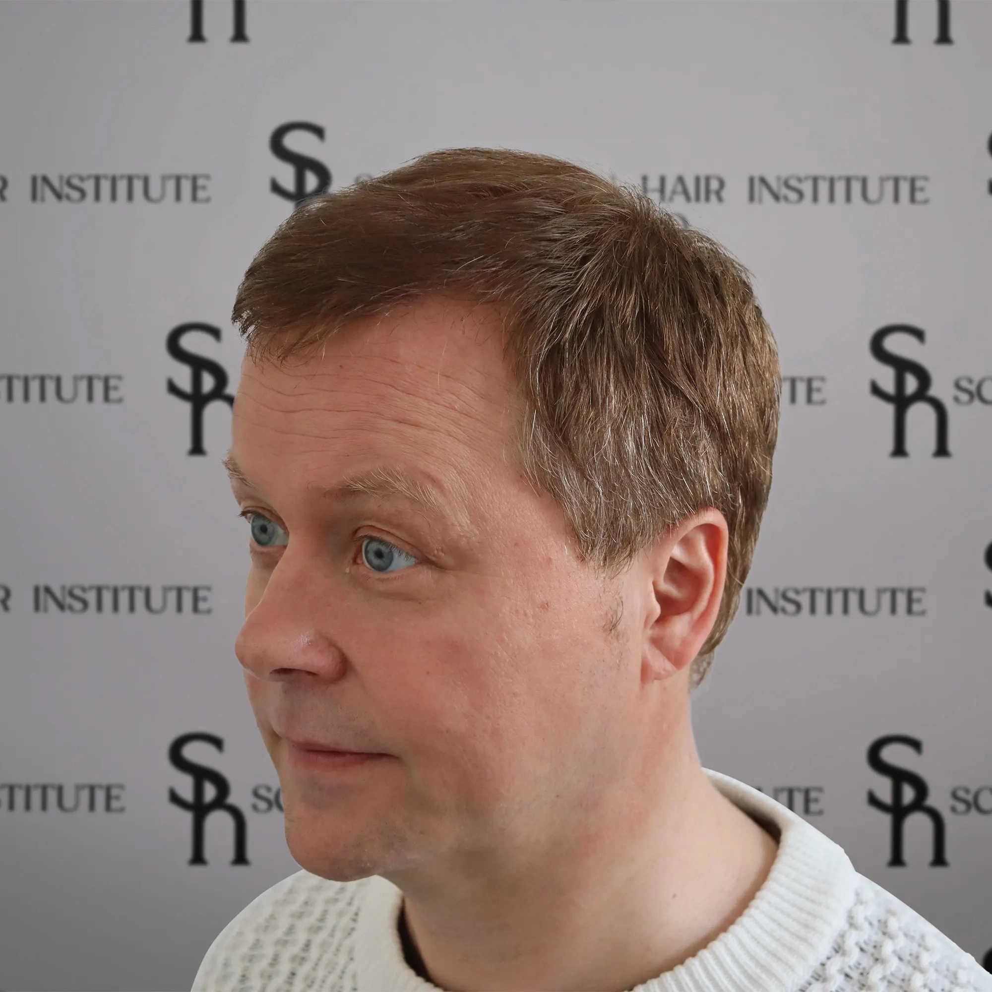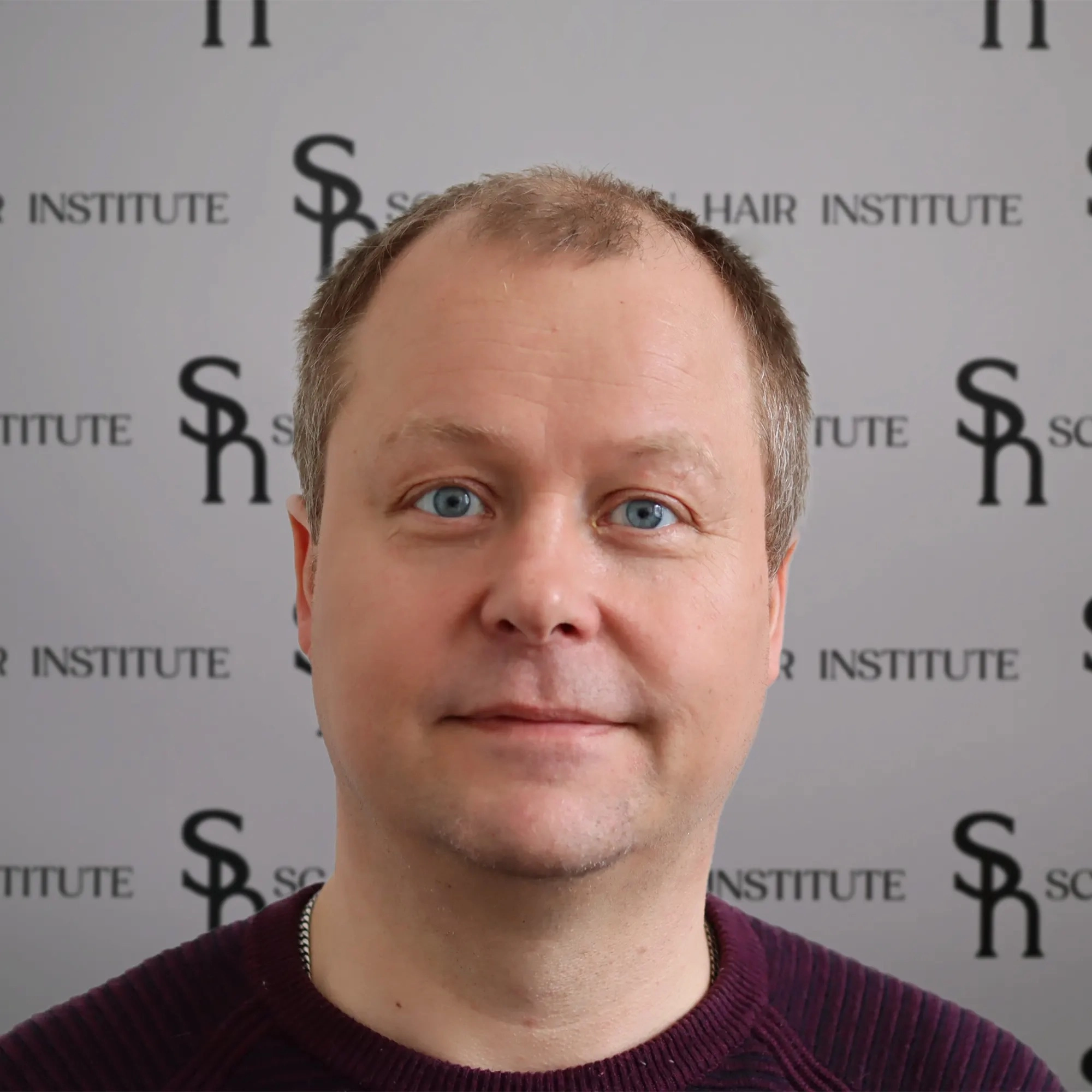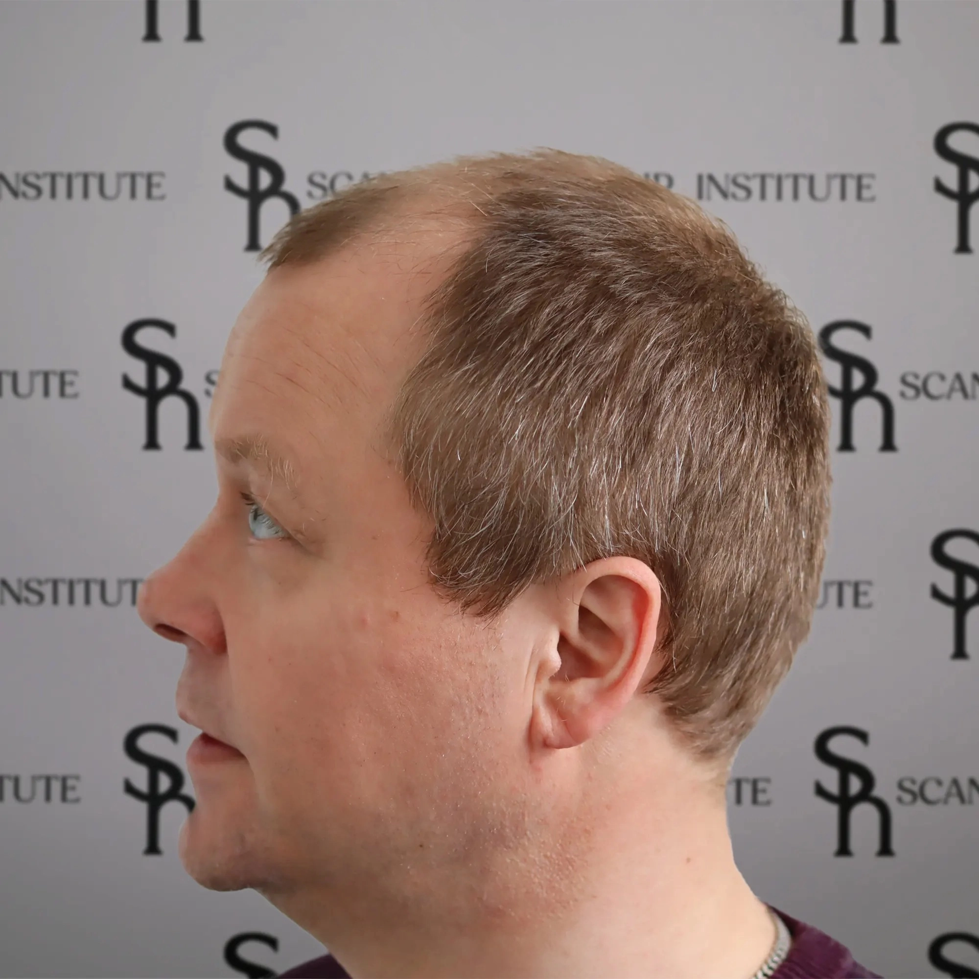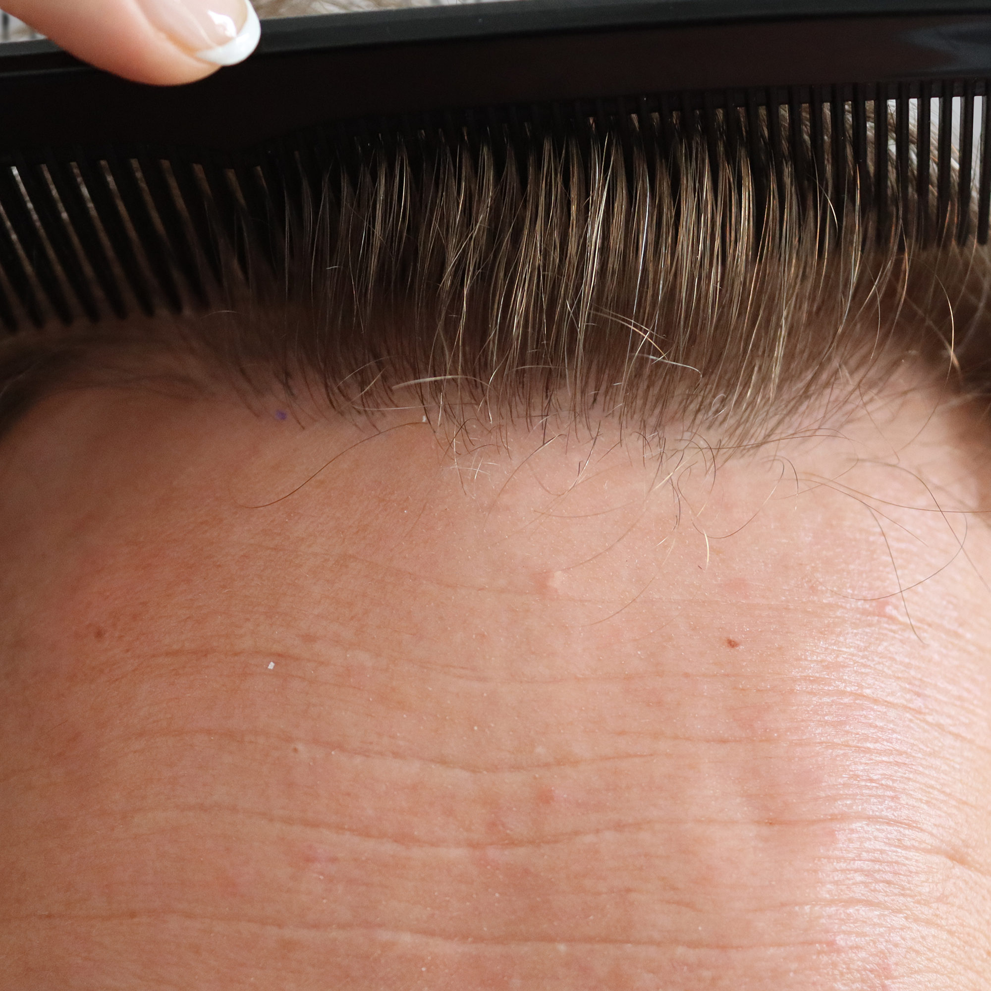 Bengt, 54 år, kom till oss från Tromsø utan hår på toppen av huvudet. Vi behandlade honom med över 5 500 hårsäcksgrupper, skapade en naturlig, åldersanpassad hårlinje, vi arbetade oss upp till kronan, och fyllde den med en tät täckning. Se detaljerade närbilder av hans hårlinje och hela hårbotten i hans album efter behandling.