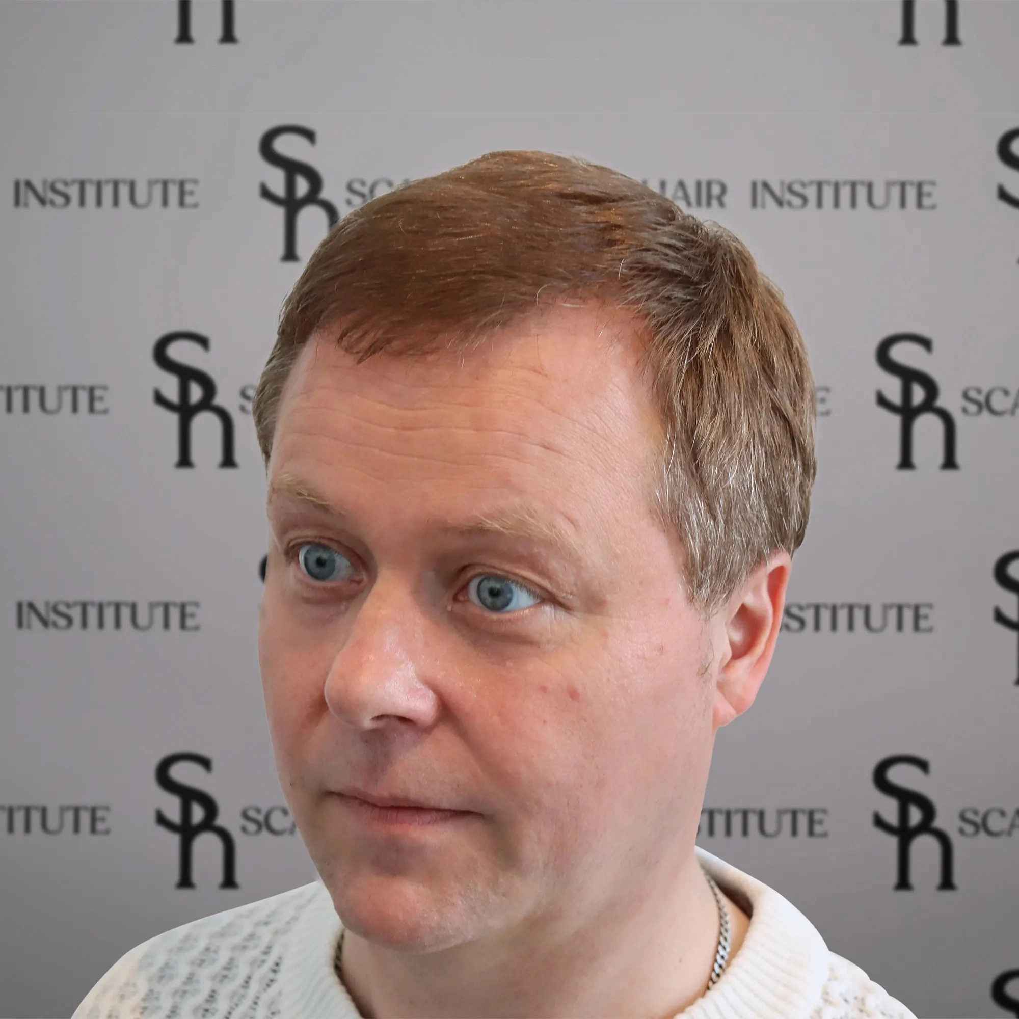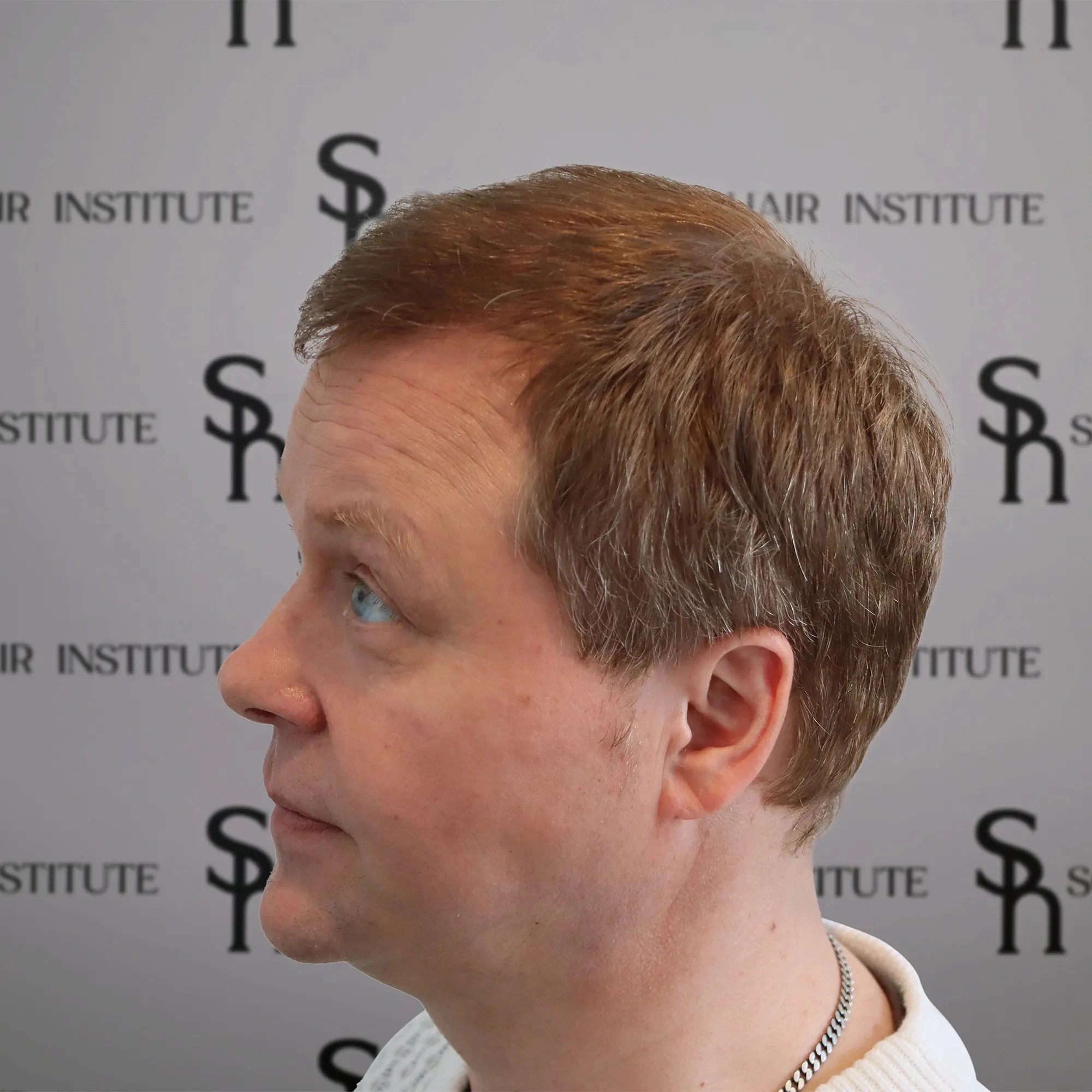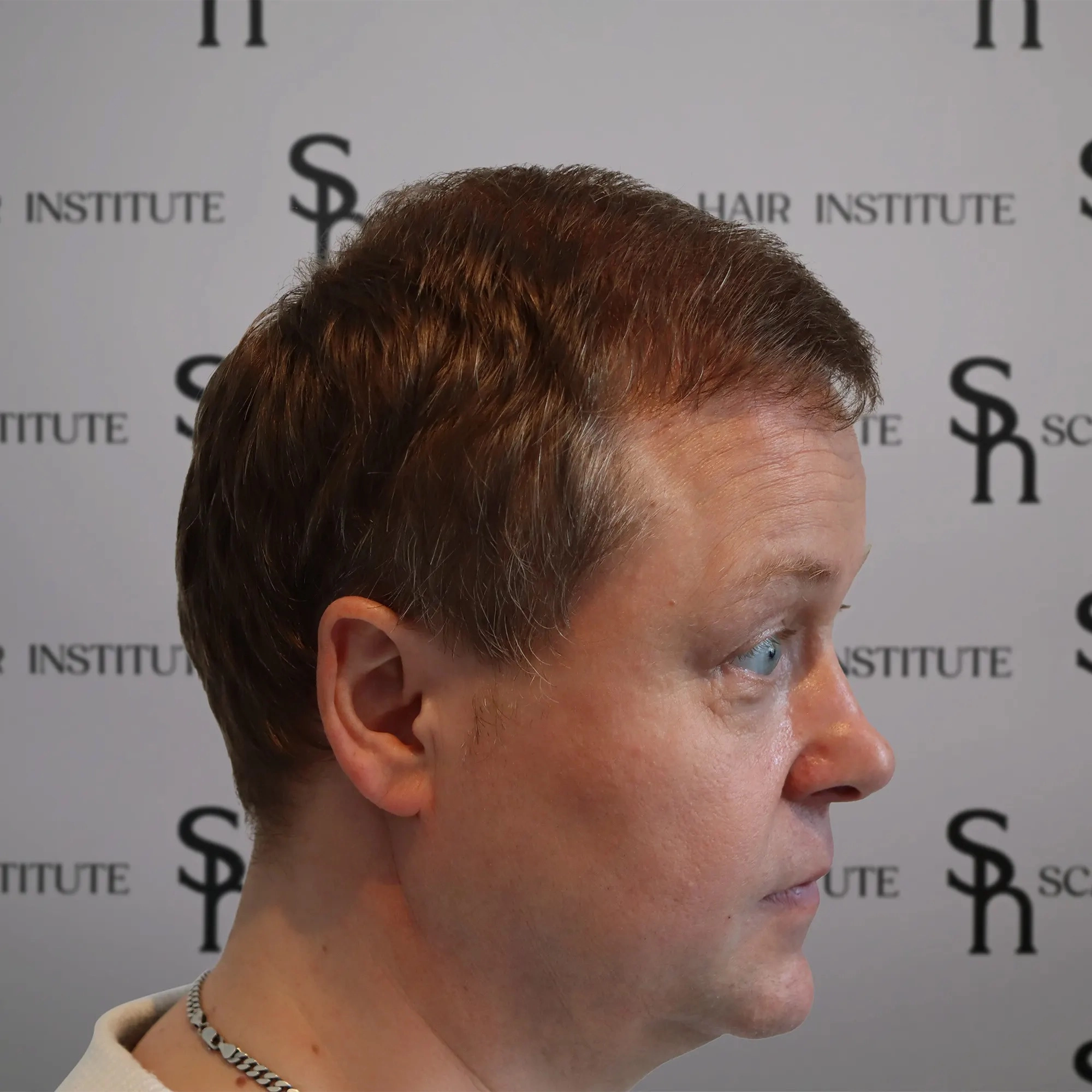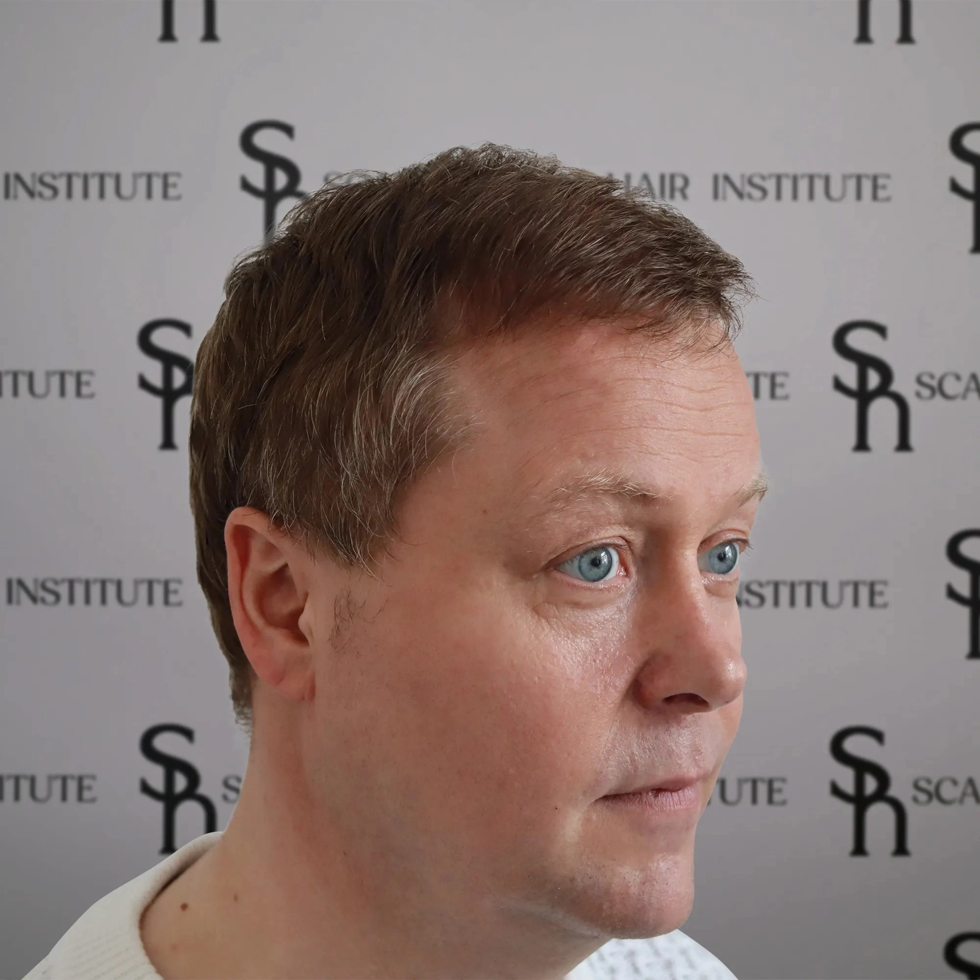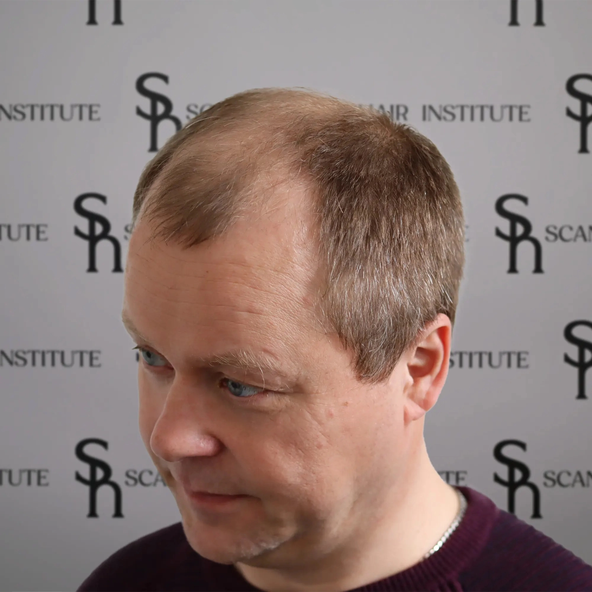 Bengt, 54 år, kom till oss från Tromsø utan hår på toppen av huvudet. Vi behandlade honom med över 5 500 hårsäcksgrupper, skapade en naturlig, åldersanpassad hårlinje, vi arbetade oss upp till kronan, och fyllde den med en tät täckning. Se detaljerade närbilder av hans hårlinje och hela hårbotten i hans album efter behandling.
