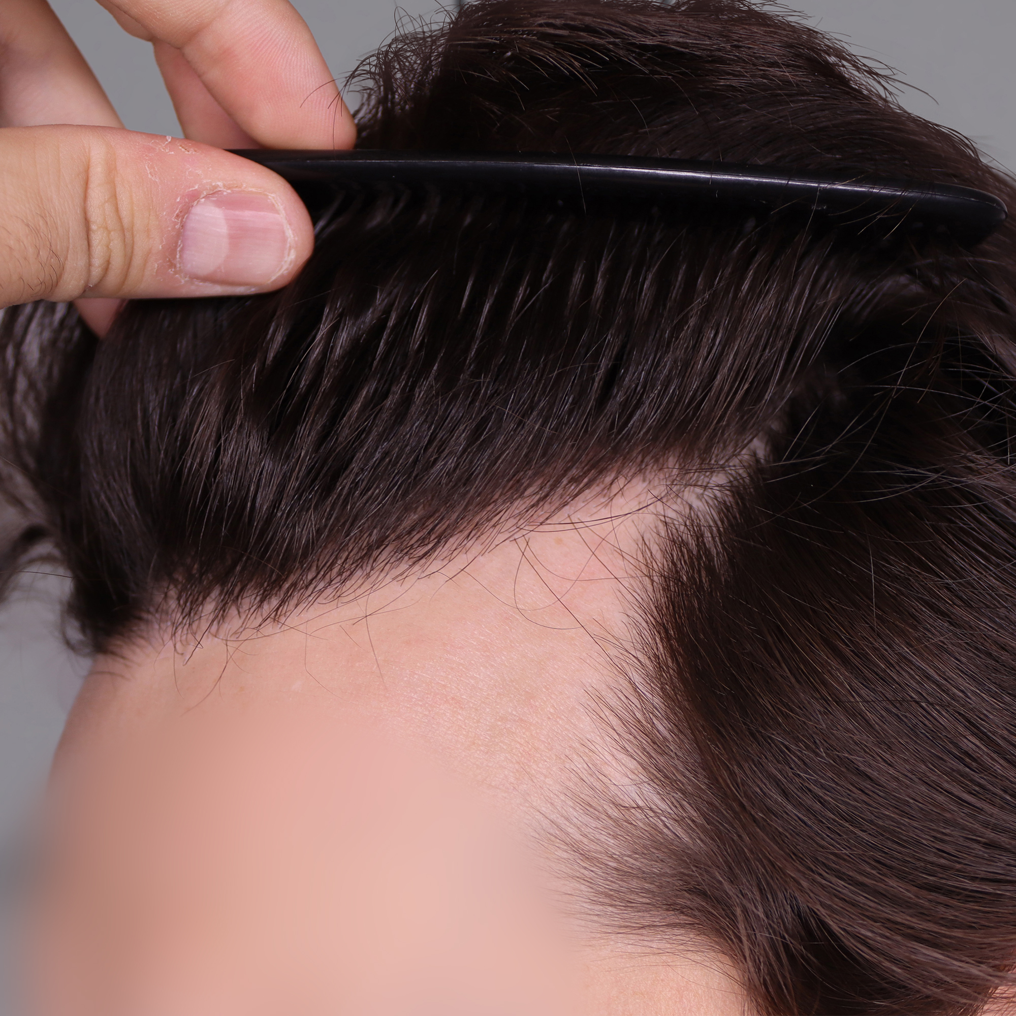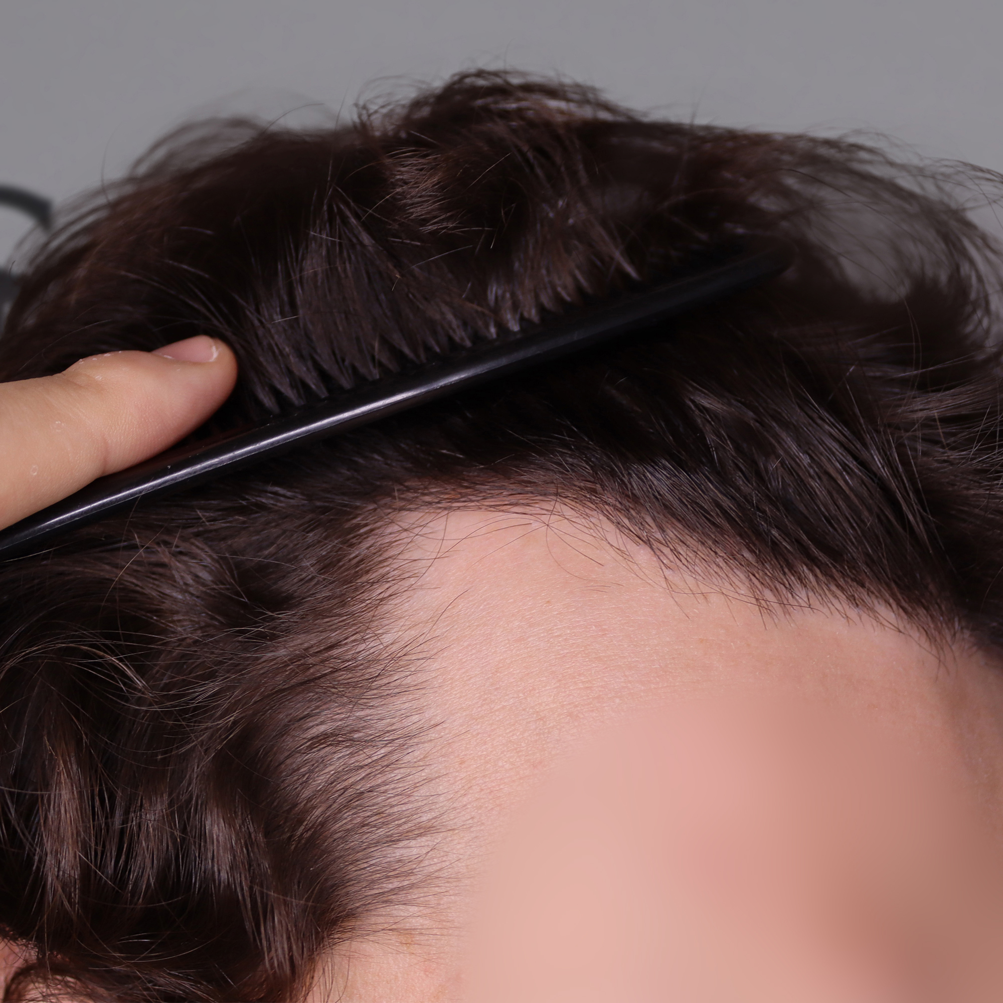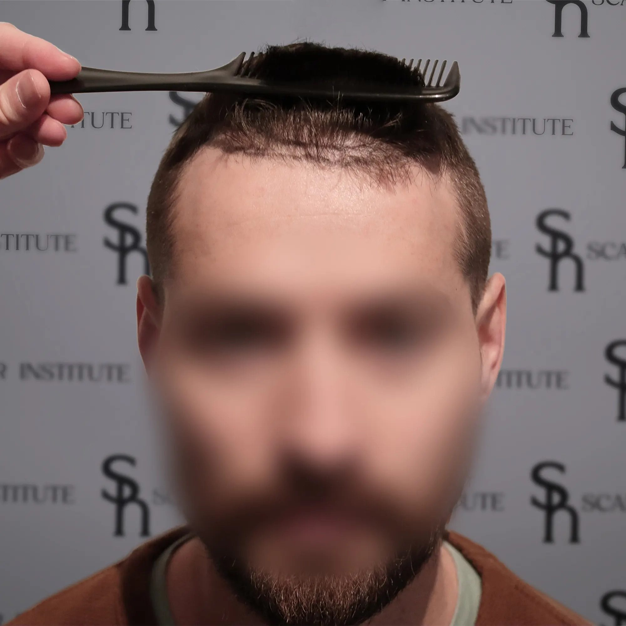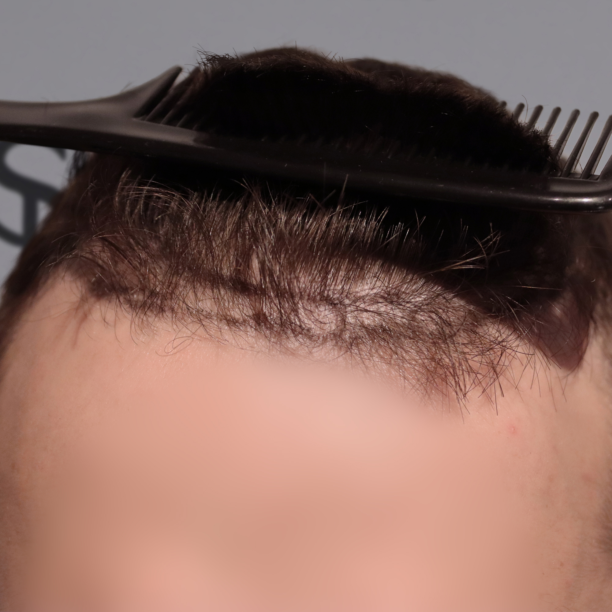 Dr. Emil är dedikerad till konstnärlig precision och säkerställer att varje detalj utförs felfritt. Han väljer noggrant ut specifika hårstrån för att skapa en hårlinje med ett naturligt utseende. I detta fall använde han 306 fina babyhår från bakom öronen för att forma fronten av hårlinjen. Bakom hårlinjen transplanterade han de återstående 1 394 tjockare hårsäcksenheterna för att tillföra volym och täthet. Denna teknik skapar ett sömlöst, naturligt resultat som gör det omöjligt att upptäcka att en transplantation har utförts.